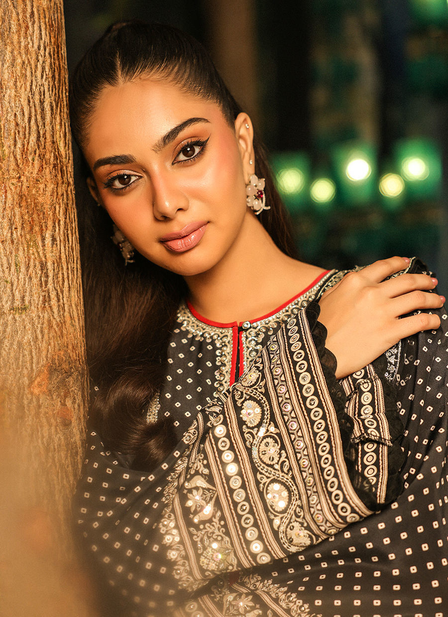 Monochrome chunri print with an elaborate silver neckline to add a mod touch.