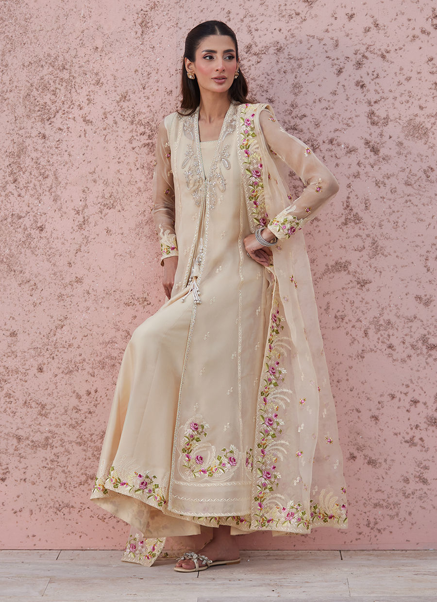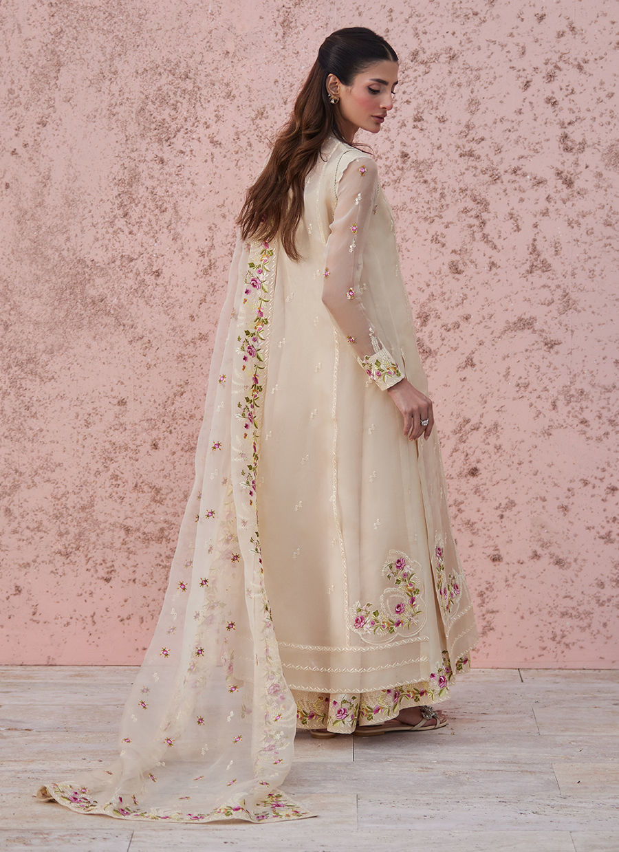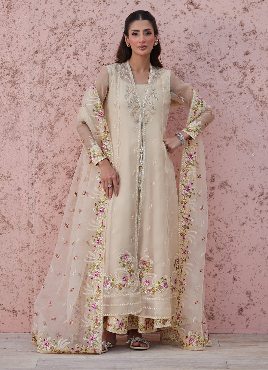Paired with a flowing inner and a beautifully embroidered organza dupatta framed with soft floral borders, the outfit carries a dreamy movement — light, fluid, and full of charm.