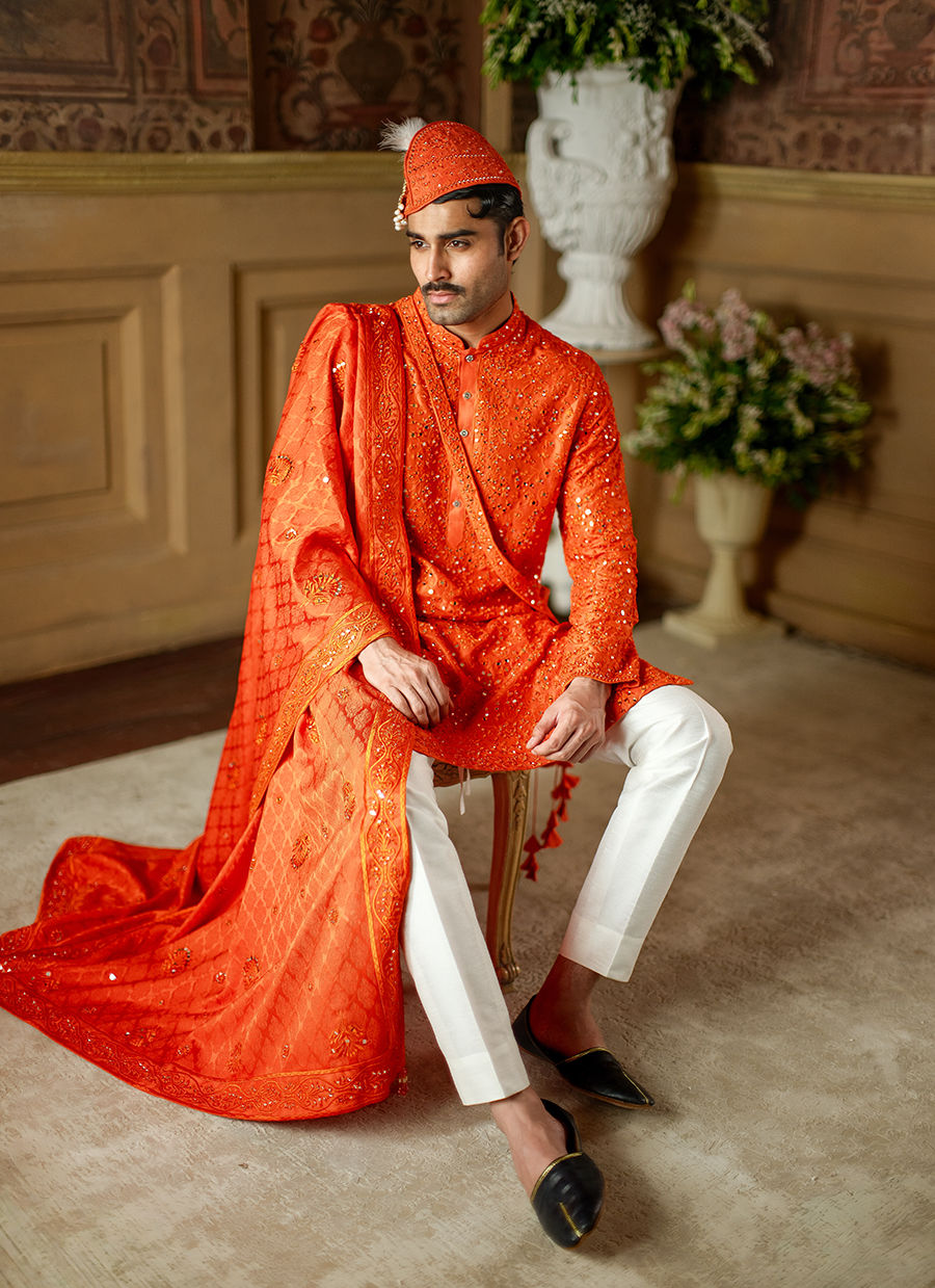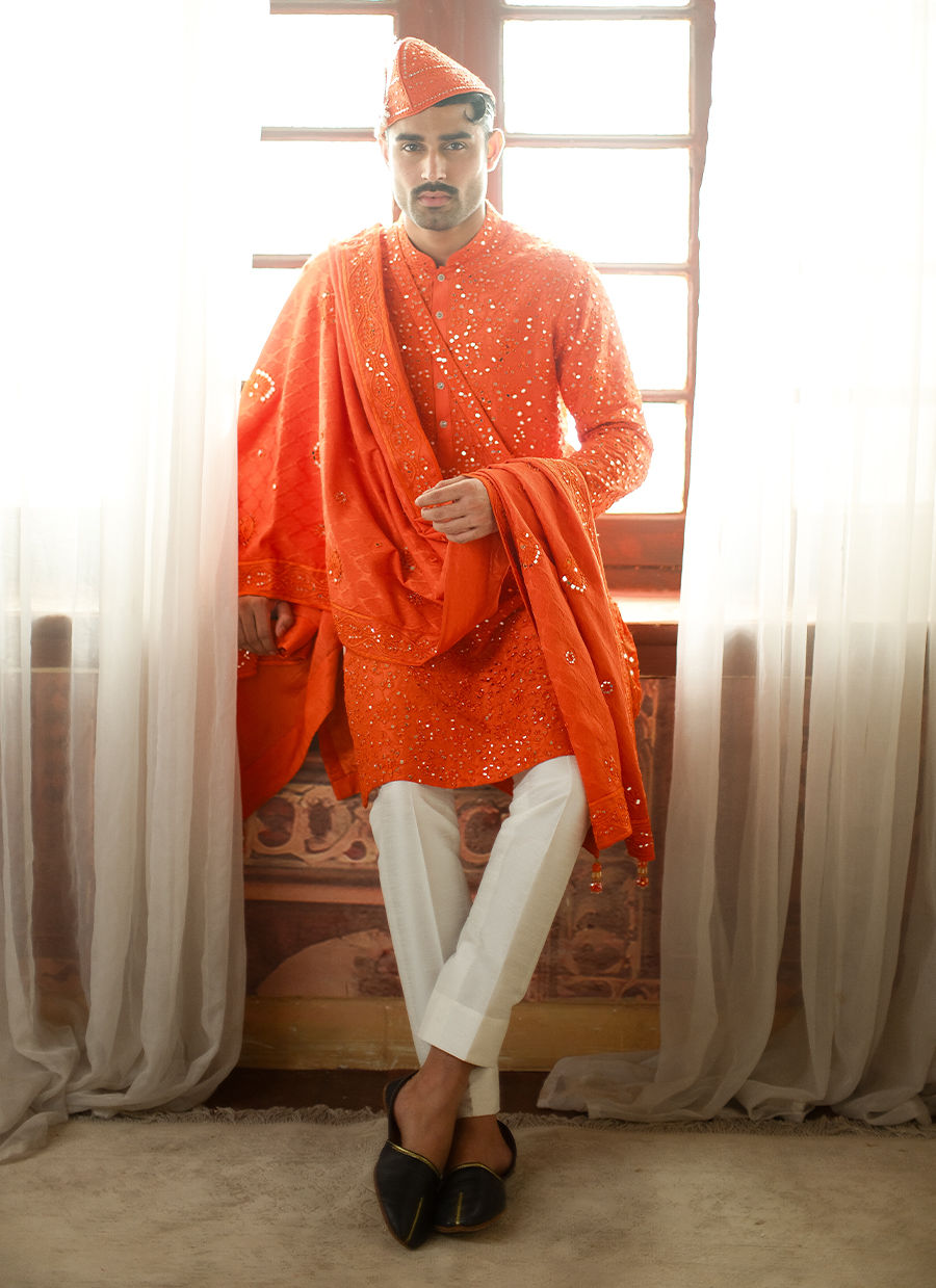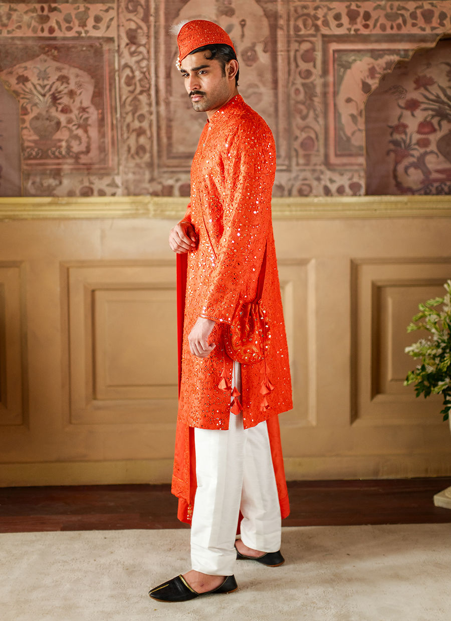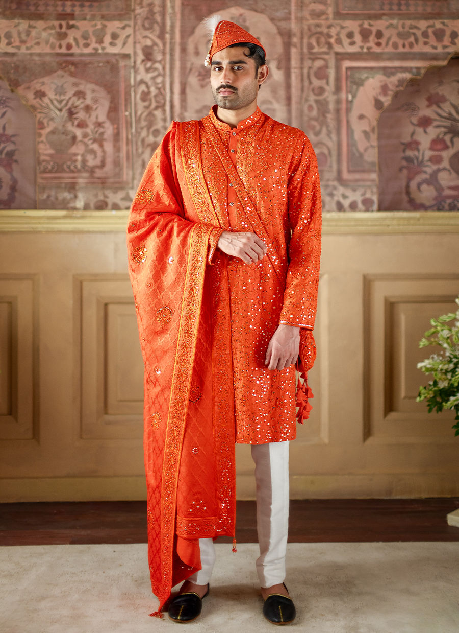 Color: Orange Fabric: Rawsilk Work Details: Mirrorwork
