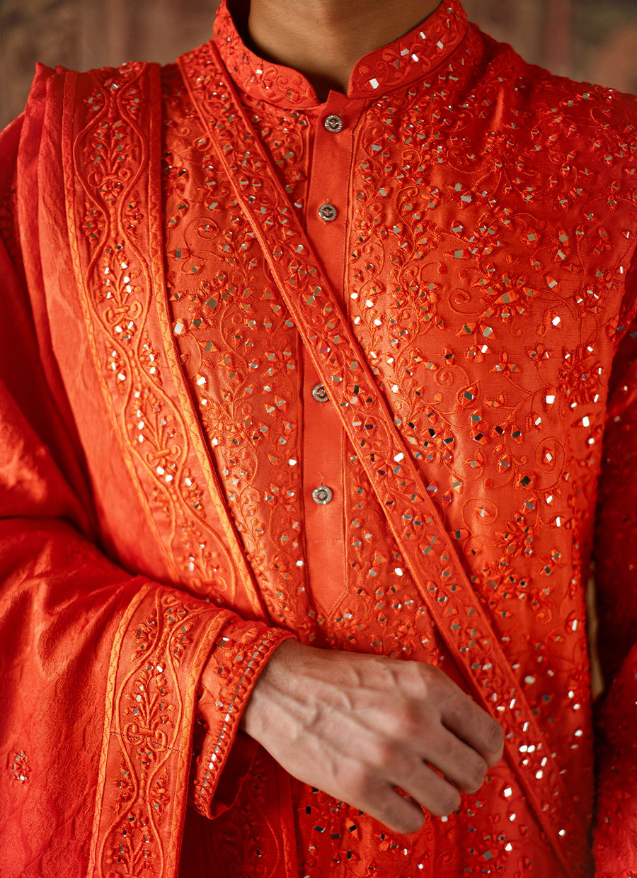 This vivid embroidered kurta, paired with a matching shawl, is meticulously crafted with our signature shimmering mirrors all over.