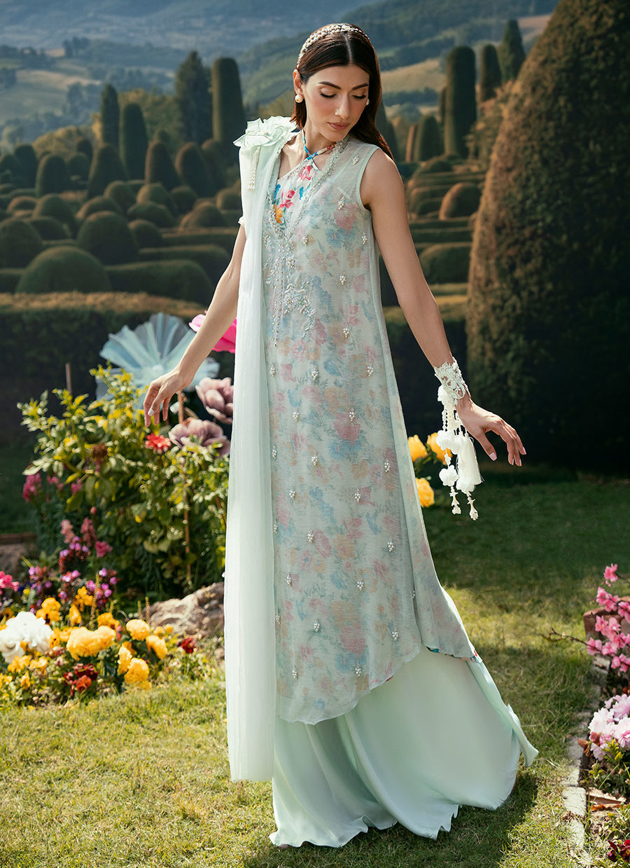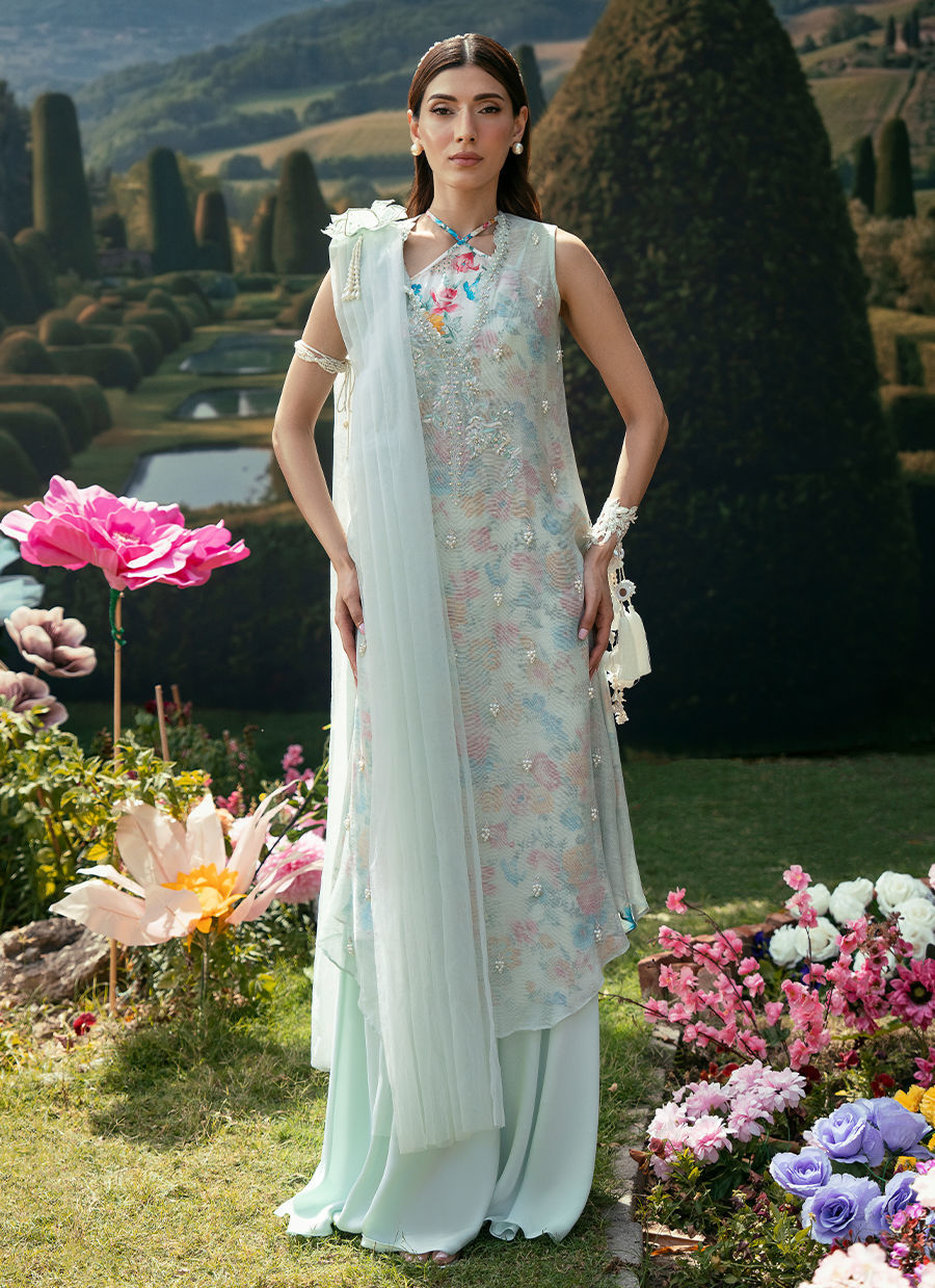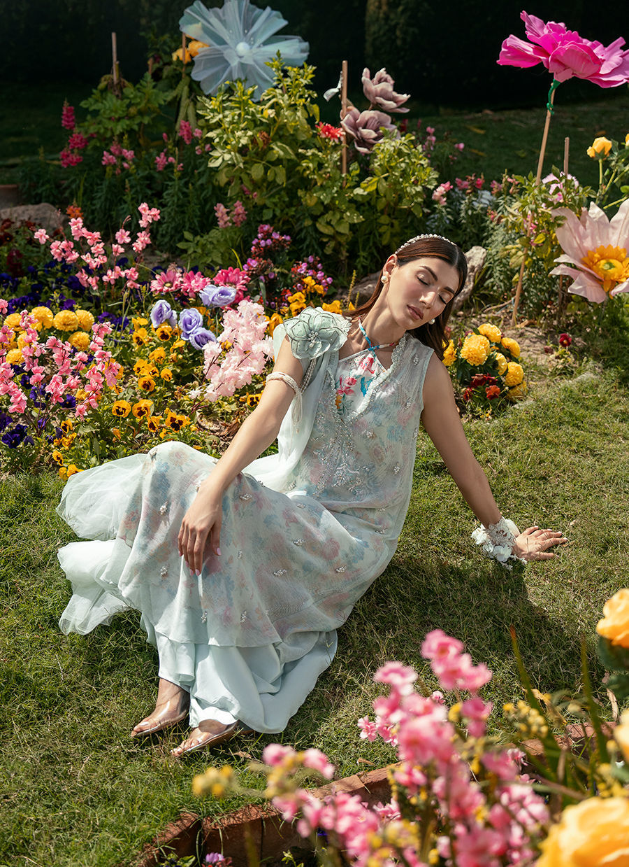 This ensemble features an A-line sleeveless shirt paired with a separate slip designed with a graceful cross neckline, delicately enhanced with subtle hand embellishments for a refined finish. Styled with clean Bambi pants and a dupatta adorned with soft floral motif, the look feels light, modern, and effortlessly elegant.