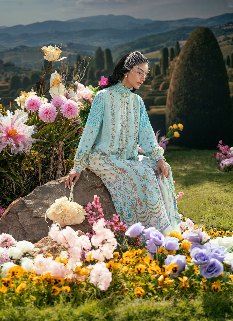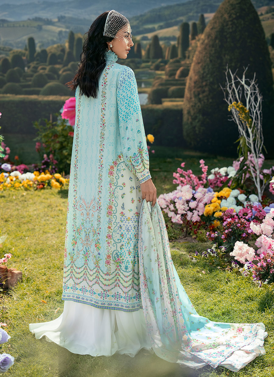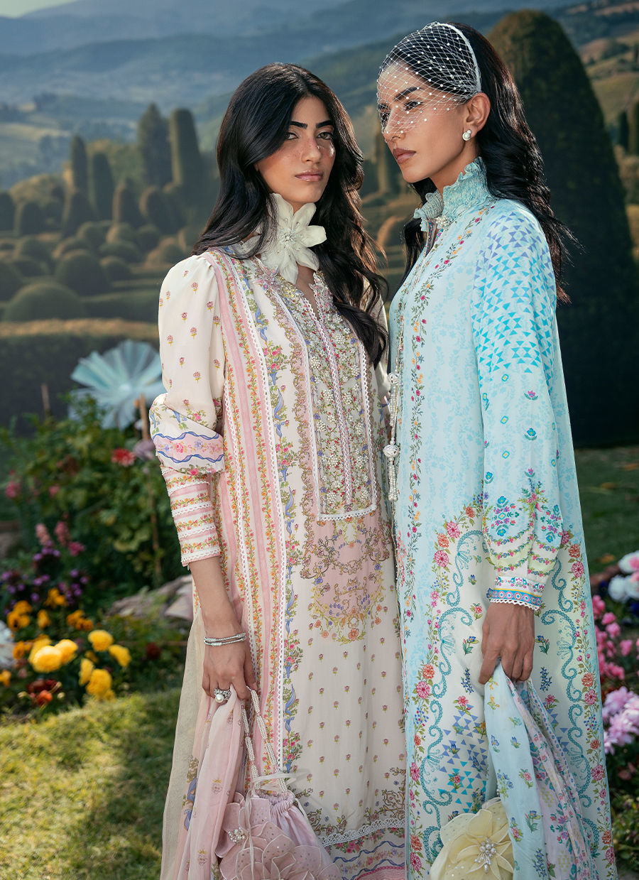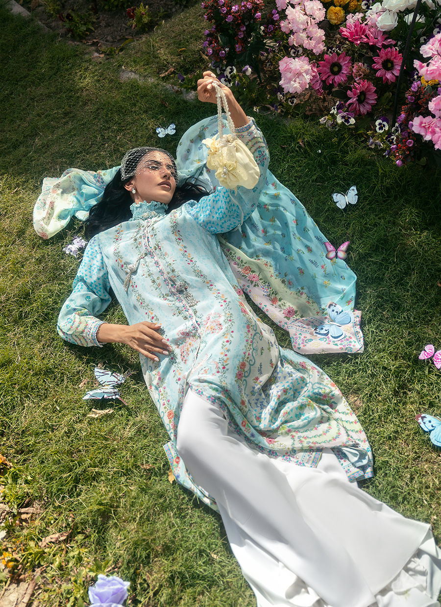 This ensemble features a front-open printed shirt defined by a refined high band neckline and a subtle front placket accented with delicate tassel detailing, adding quiet movement to the silhouette. The shirt’s print lends depth while maintaining an elegant restraint, balancing structure with softness. It is paired with white Bambi pants that enhance the look with a clean, modern contrast, while the coordinated printed dupatta completes the outfit with a cohesive, fluid charm.