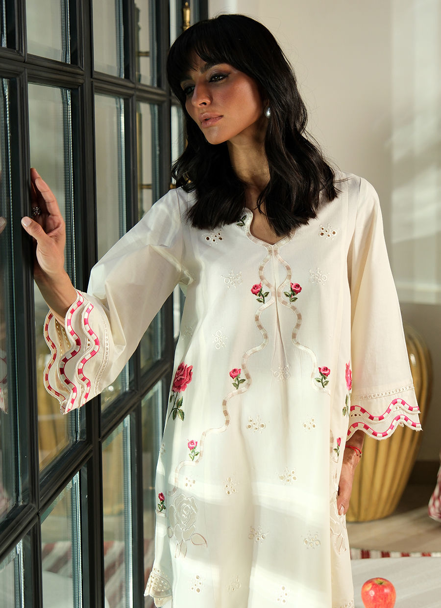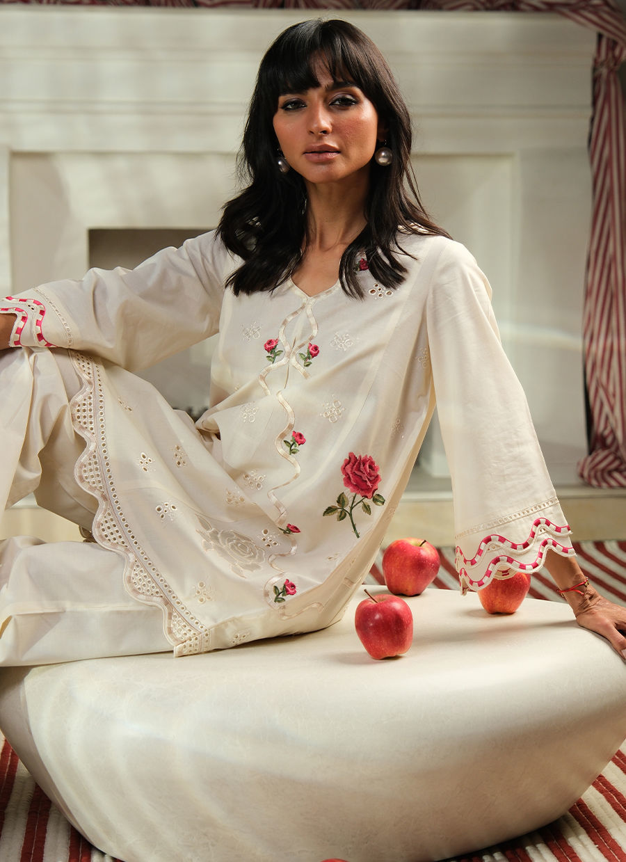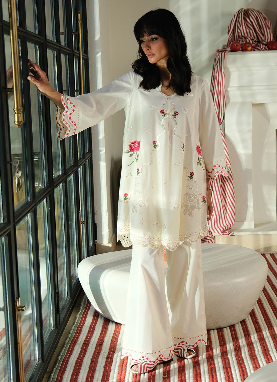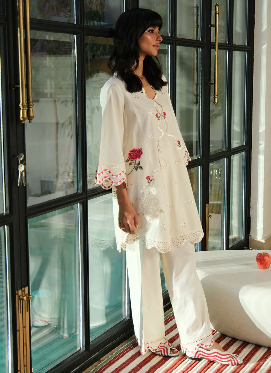 "Designed in breathable pure cotton, this outfit features the most beautiful rose embroidery as well as organza appliqué roses. Playful red-and-white striped embroidery accents the neckline, sleeves, hem and pants, adding a fresh, whimsical touch. The ensemble is light, comfortable, and perfect for effortless spring style."