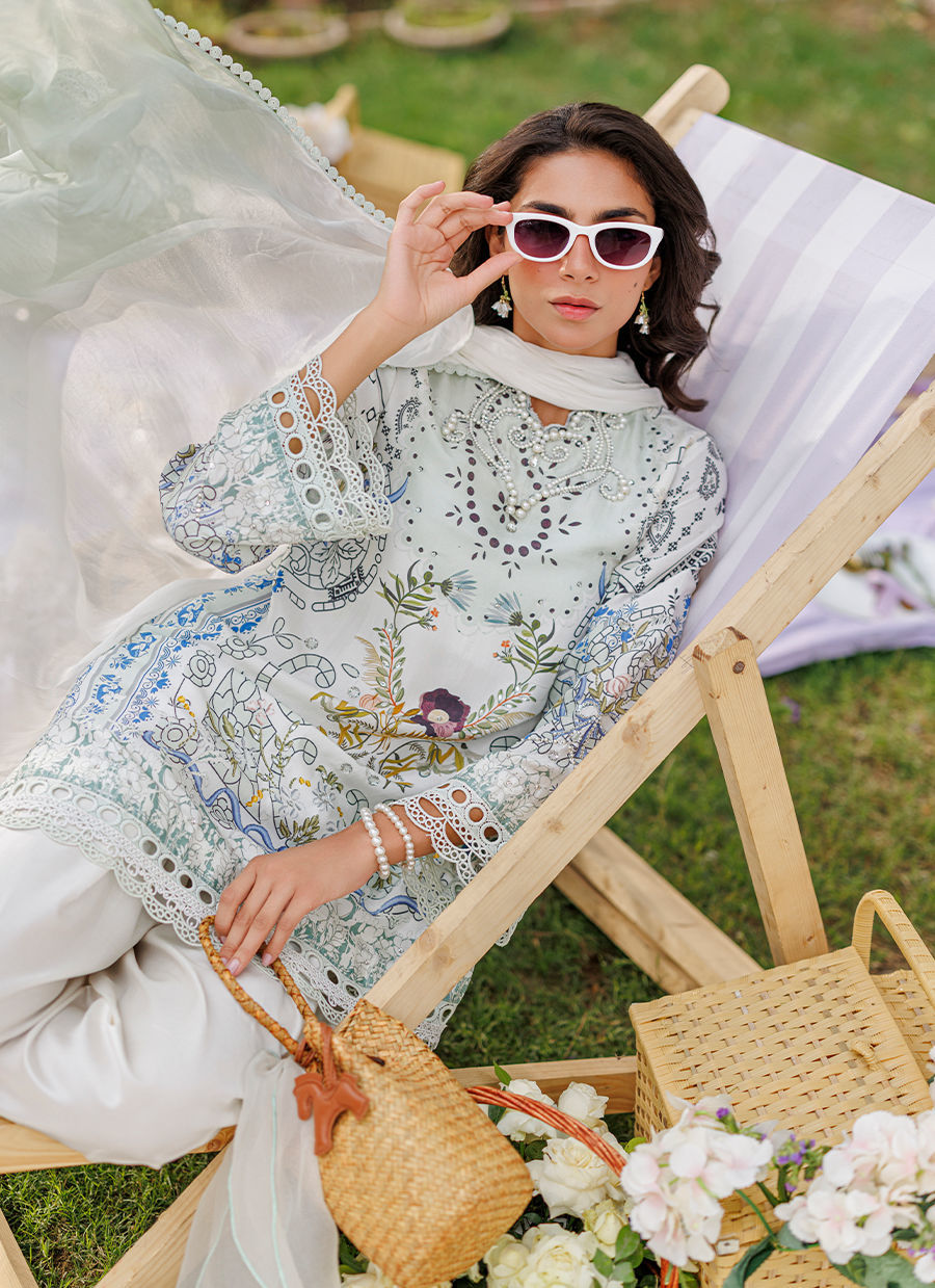 A stunning matcha-printed raw silk ensemble featuring bold pearl embellishments and statement crystals along the neckline. The sleeves and border are delicately finished with lace detailing, complemented by a white shalwar with a printed border and lace appliqué. A medium silk ombré dupatta completes the look, highlighting the fresh, vibrant matcha hue with elegance and charm. *Model is 5'10" and is wearing a size small.