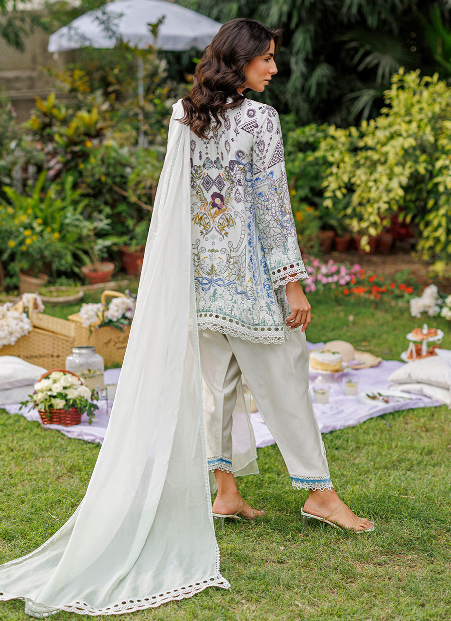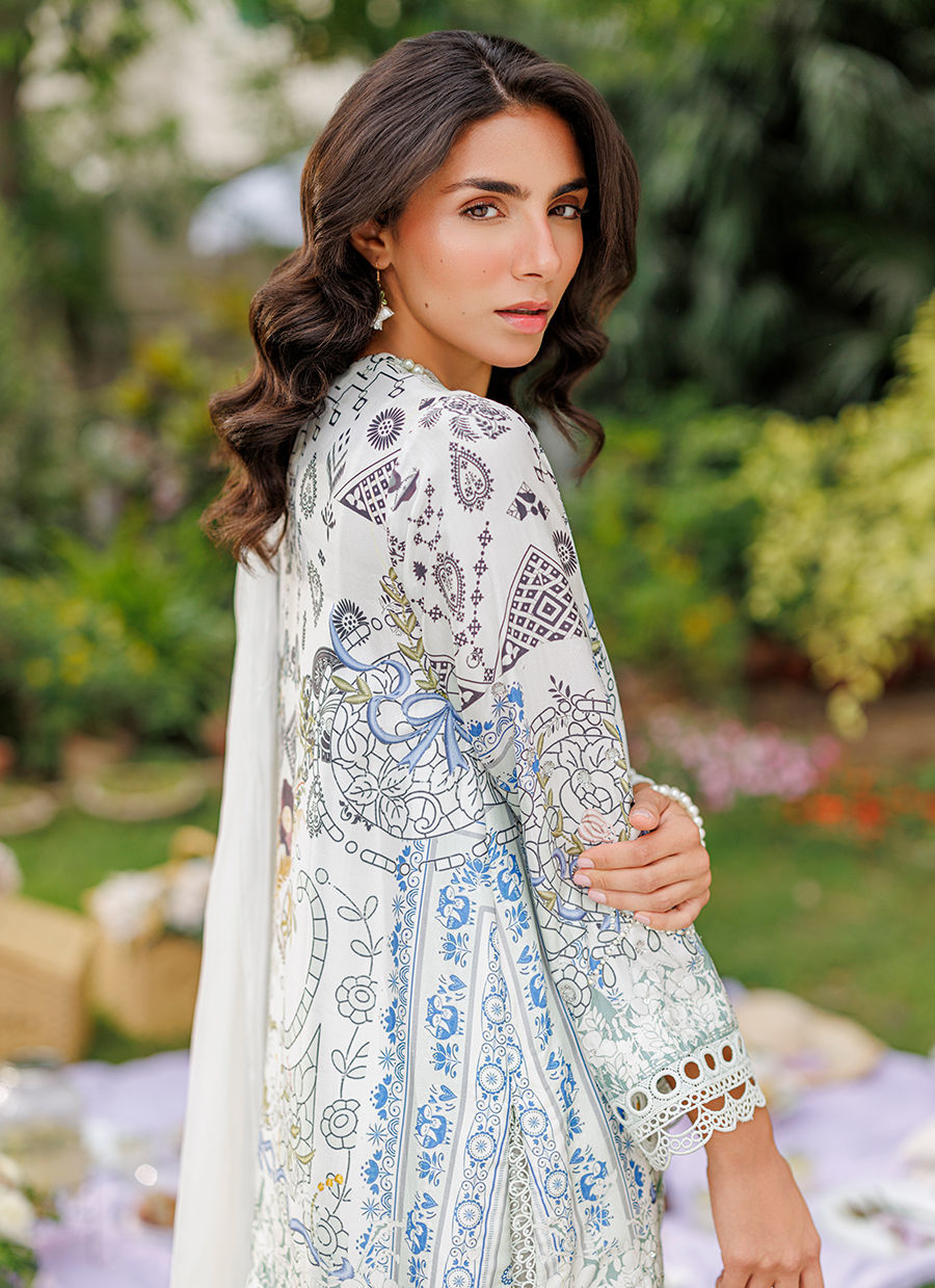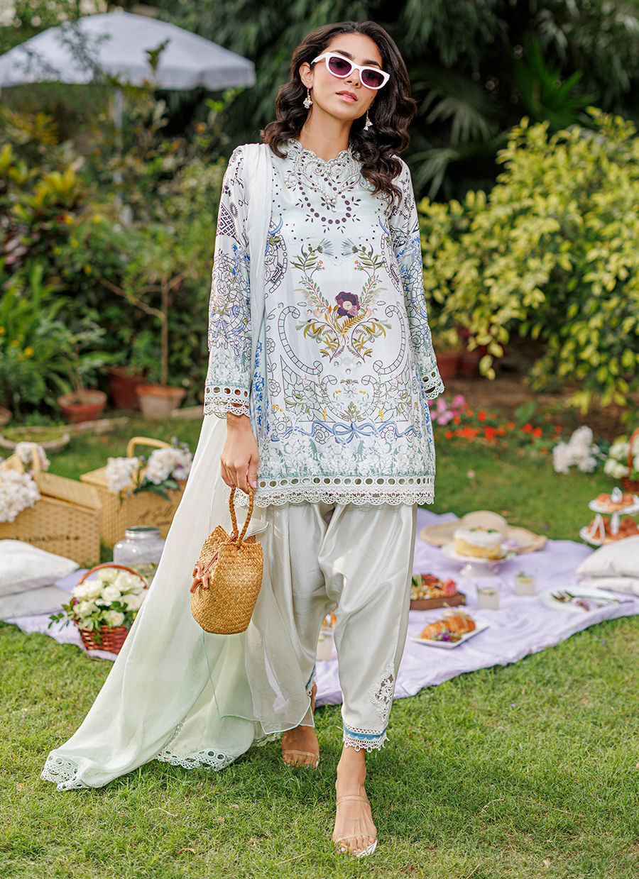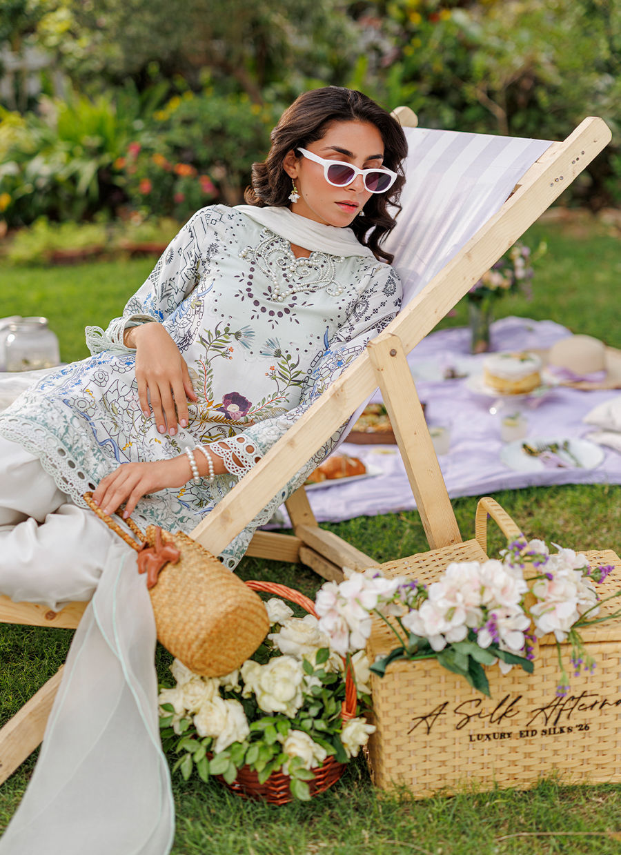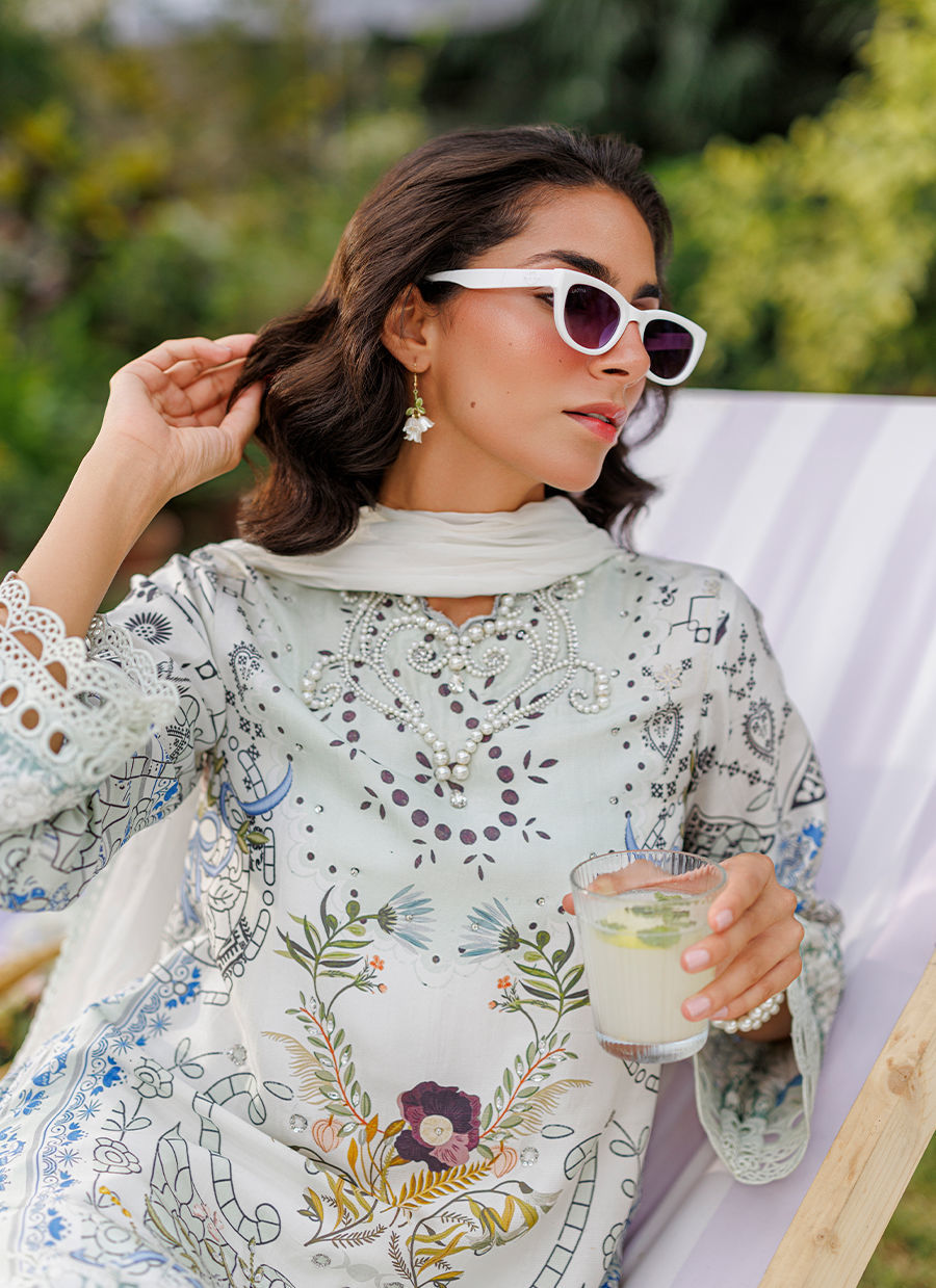 A stunning matcha-printed raw silk ensemble featuring bold pearl embellishments and statement crystals along the neckline. The sleeves and border are delicately finished with lace detailing, complemented by a white shalwar with a printed border and lace appliqué. A medium silk ombré dupatta completes the look, highlighting the fresh, vibrant matcha hue with elegance and charm. *Model is 5'10" and is wearing a size small.