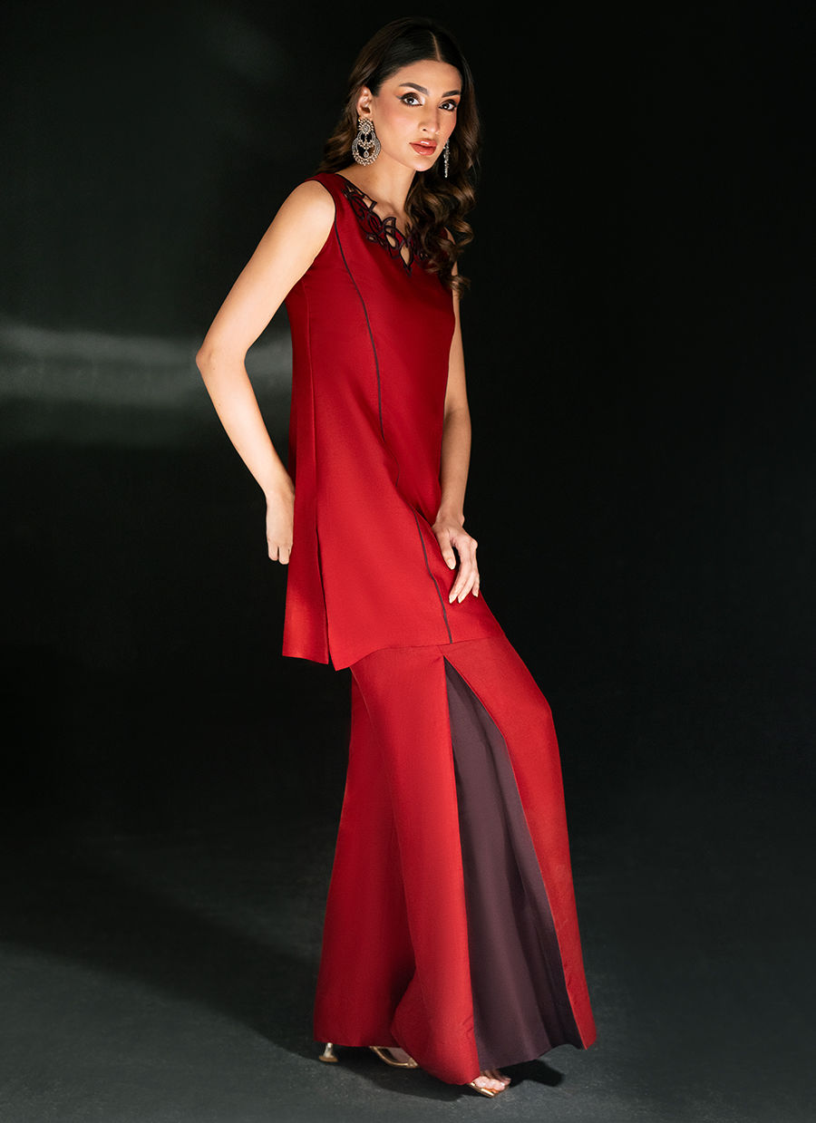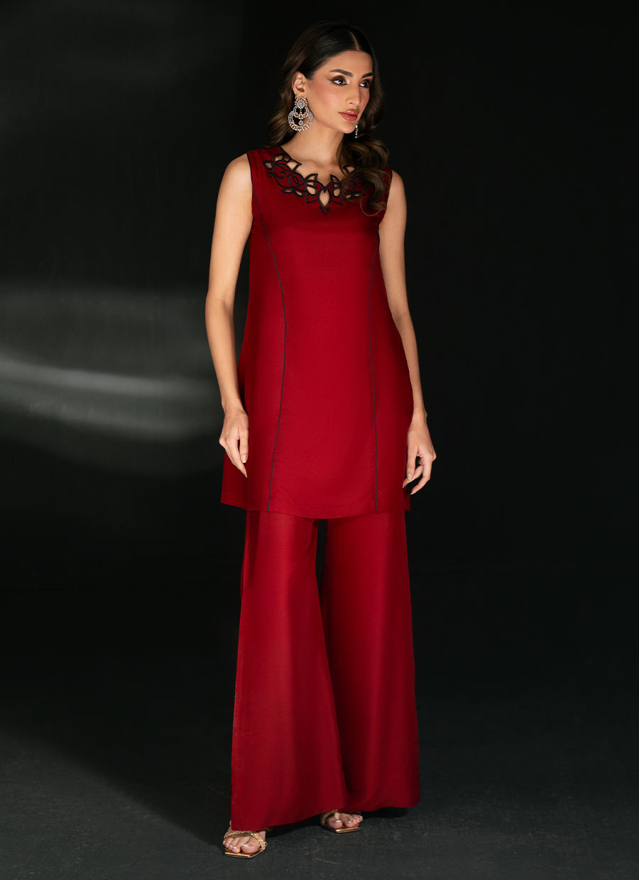 A bold interplay of red and deep burgundy crafted in luxurious rawsilk. This contemporary silhouette features a sleeveless shirt adorned with intricate cutwork embroidery along the neckline, adding texture and refined detail. Paired with statement box-pleated wide leg pants in a rich contrasting tone, the ensemble flows with effortless drama and movement. Modern yet timeless, Crimson Muse is designed for evenings that call for confidence and undeniable presence.