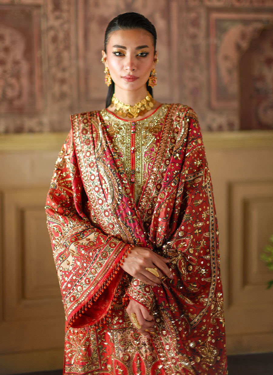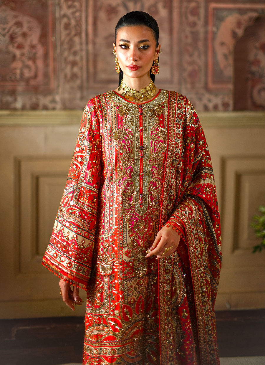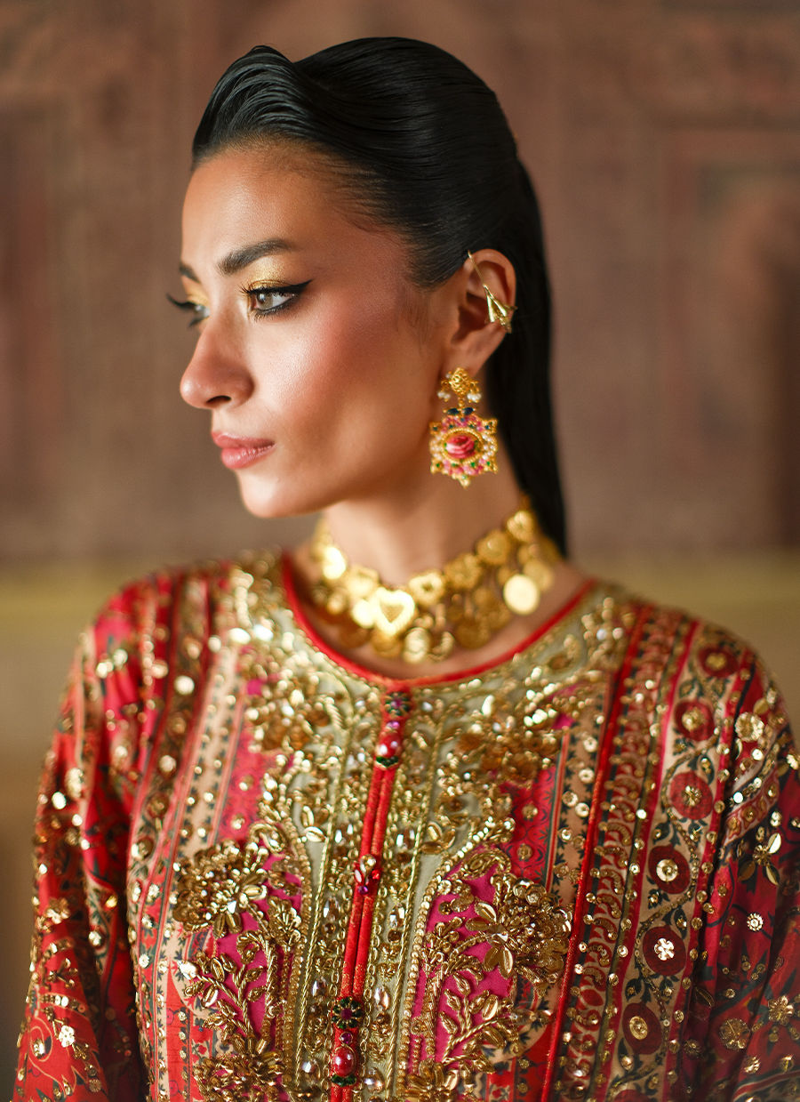 A statement muti-hued piece in vivid reds, crimson and coral. Adorned with intricate, shimmering embellishments in rich tones of gold. A true symphony of craftsmanship and colour.