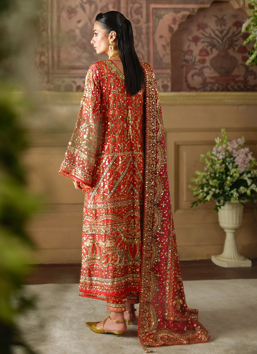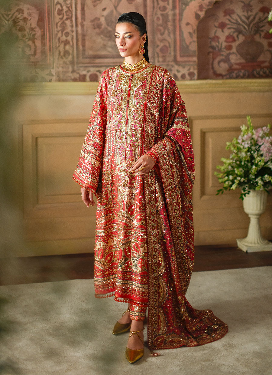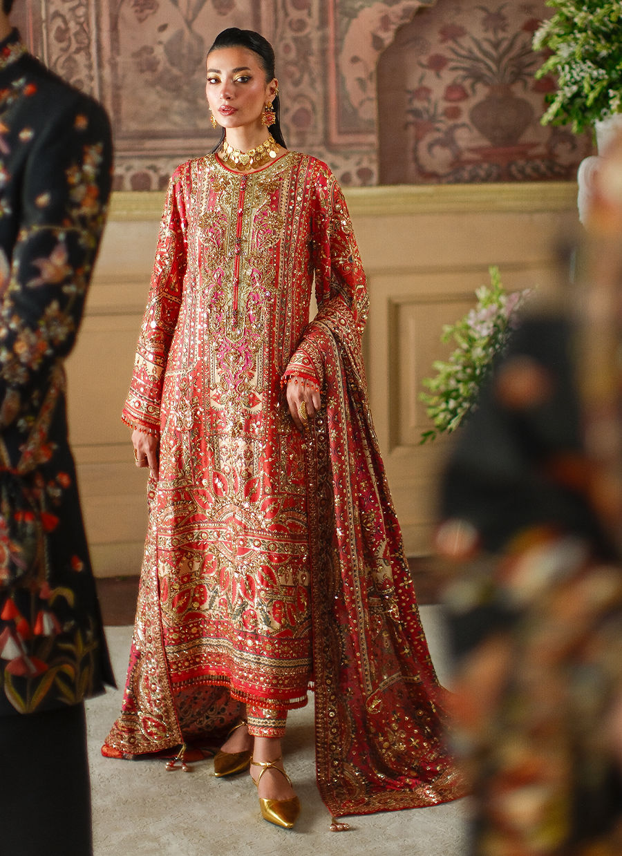 A statement muti-hued piece in vivid reds, crimson and coral. Adorned with intricate, shimmering embellishments in rich tones of gold. A true symphony of craftsmanship and colour.