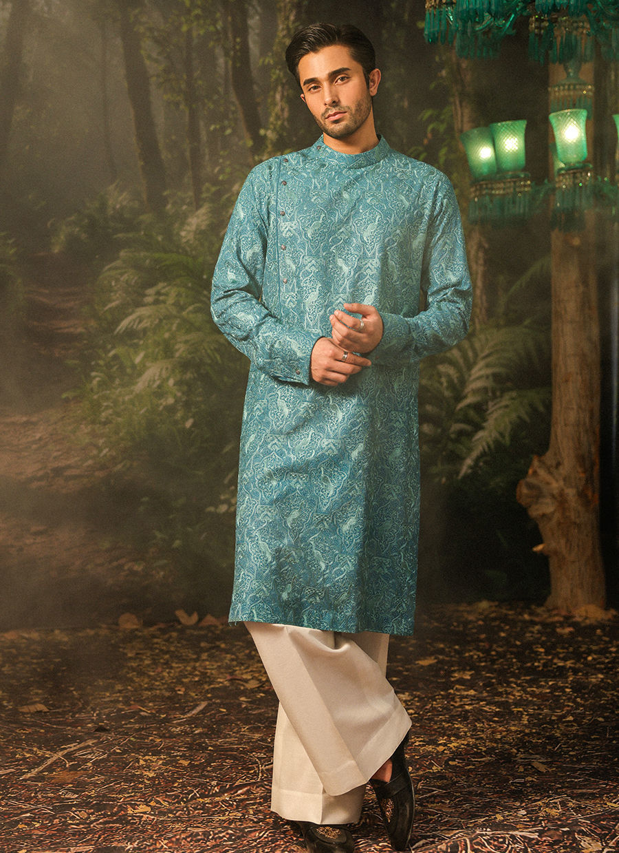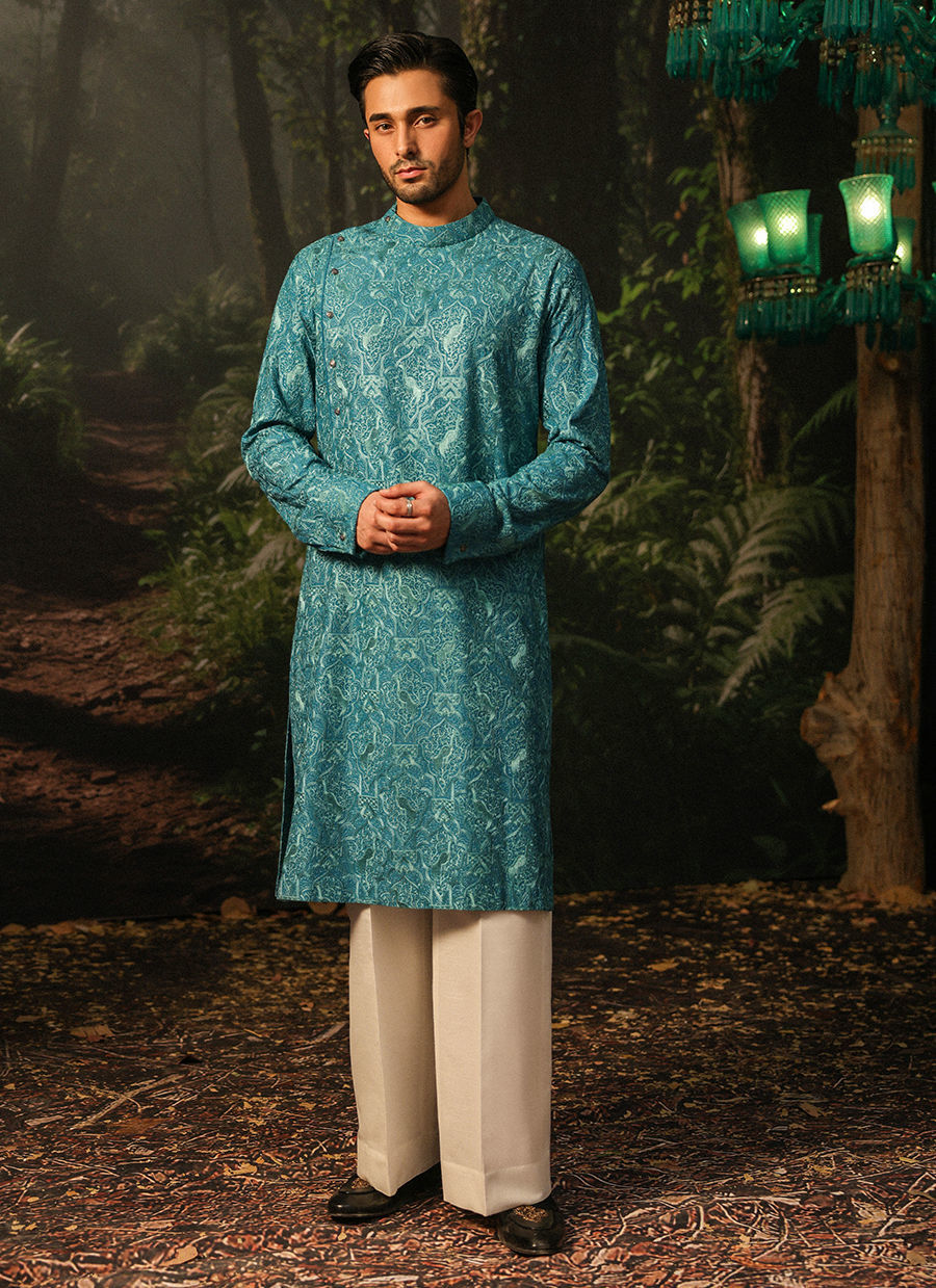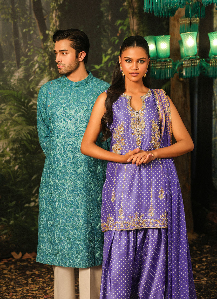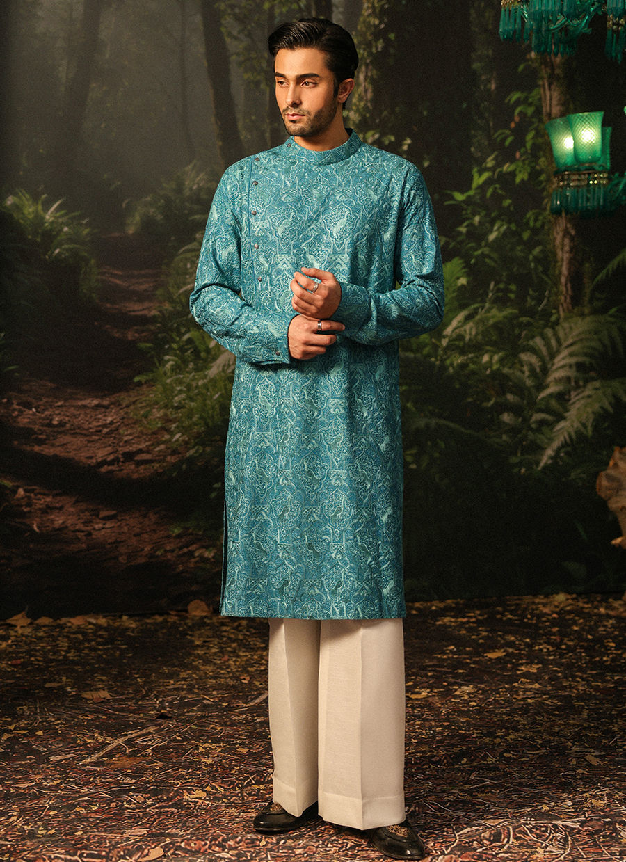 A gorgeous shade of teal blue with rich embroidery for a two-toned effect. Comes with raw silk pants.