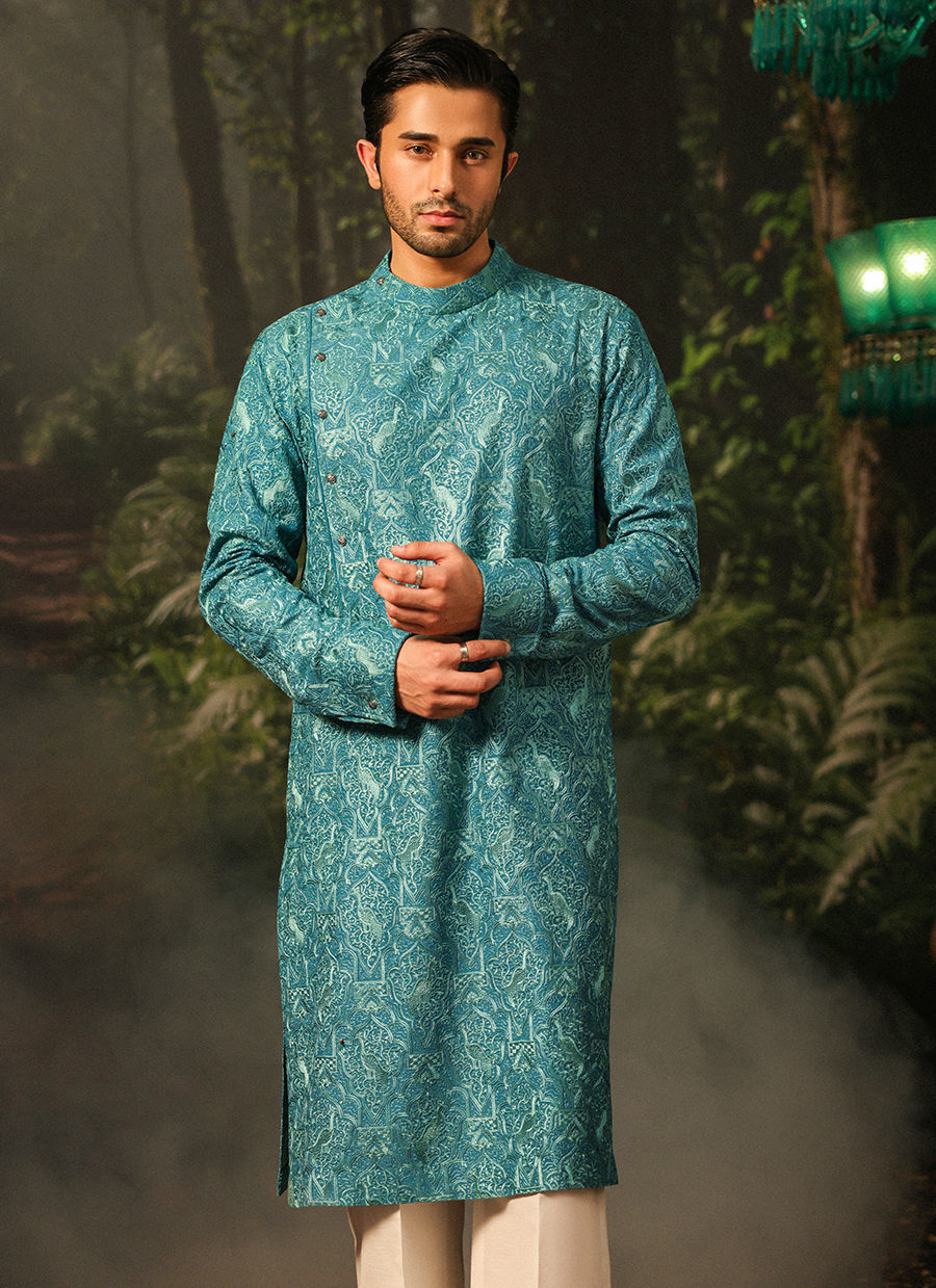 Color: Teal Fabric: Self Embroidered Work Details: Thread Embroidery