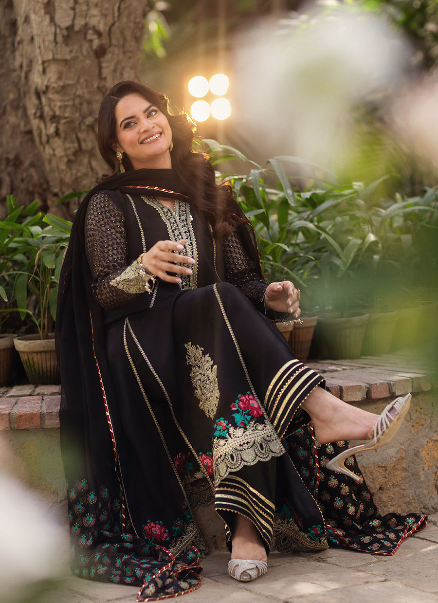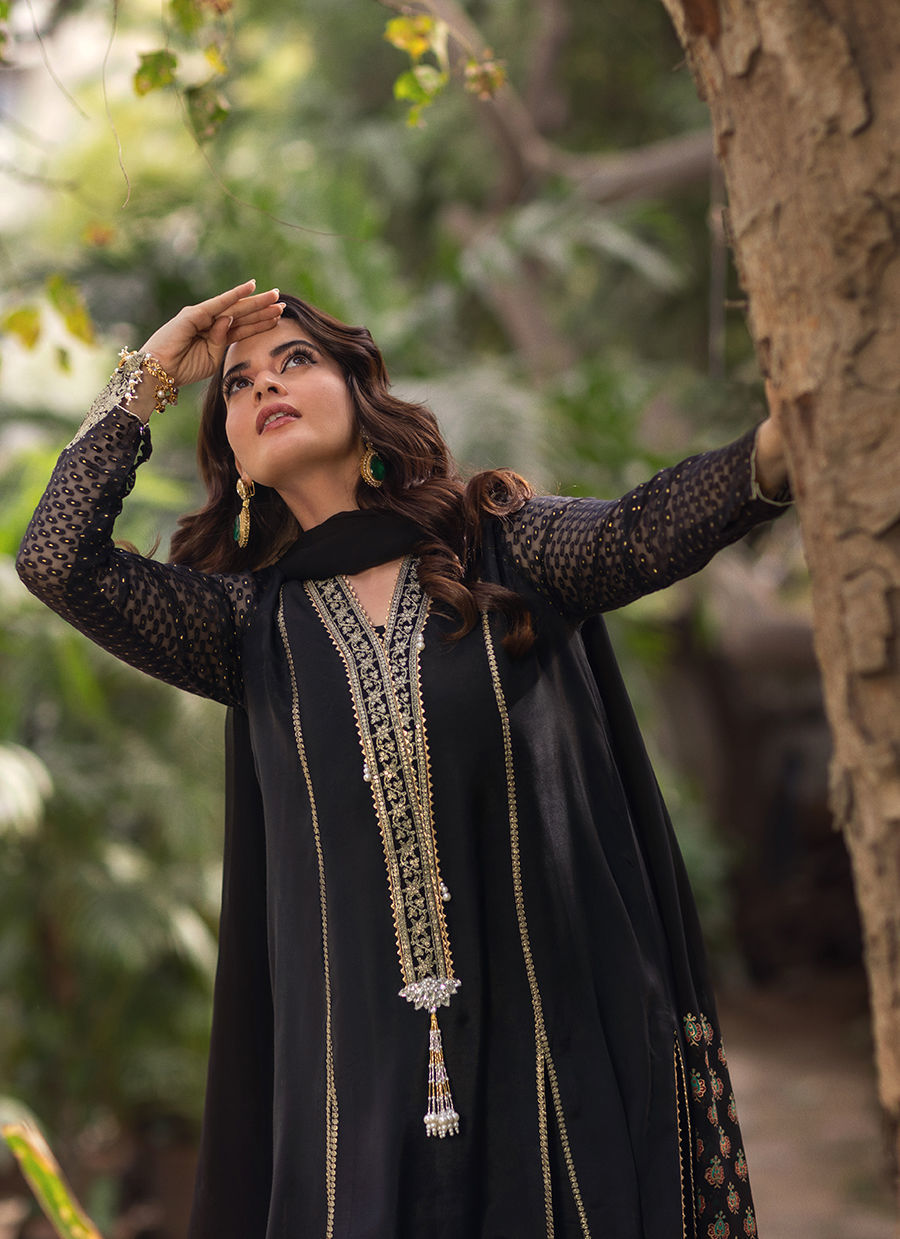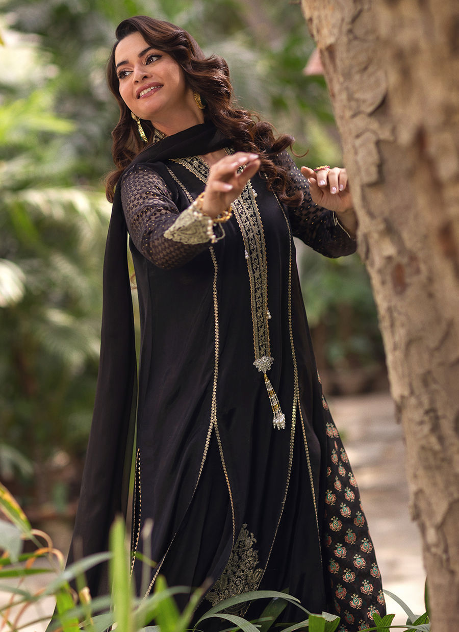 A long-silhouette shirt crafted in classic black silk, elegantly detailed with delicate pearl embellishments along the neckline for a subtle, refined shimmer. The sleeves are fashioned in lustrous Lurex and adorned with intricate pearl accents, adding a contemporary touch. The hem is finished with rich gold zari work and embroidered borders, enhancing the silhouette with artisanal depth. The ensemble is paired with a silk azaar featuring refined gota detailing and is completed with a chiffon dupatta, adorned with graceful hand block–printed details for a polished, sophisticated finish.