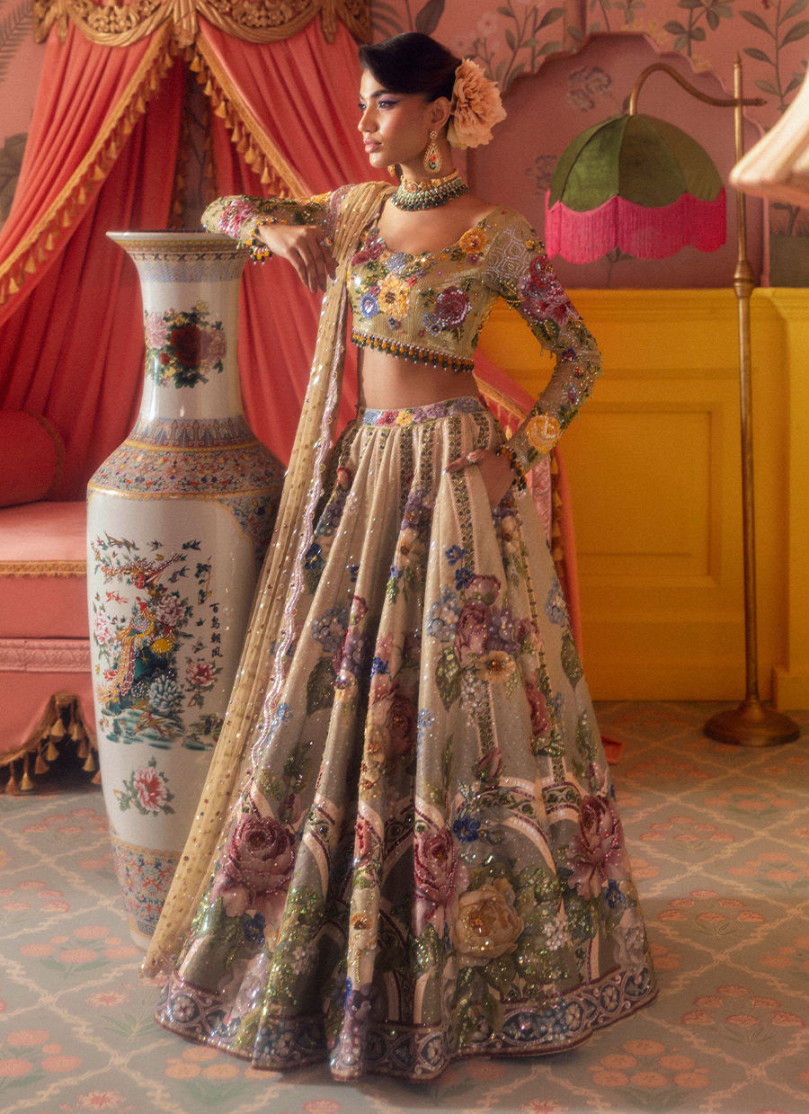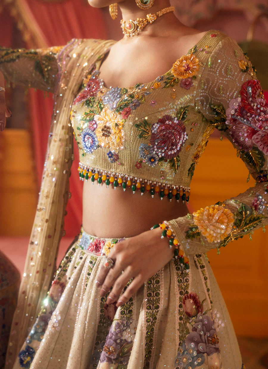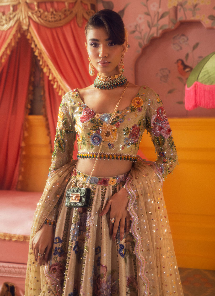 Vibrant summer blooms dance across this stunning lehenga, adorned with oversized floral motifs. Perfect for daytime weddings or mehndi celebrations.