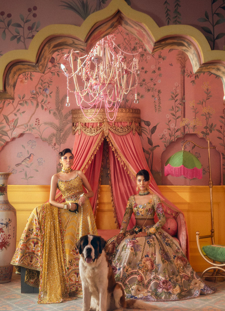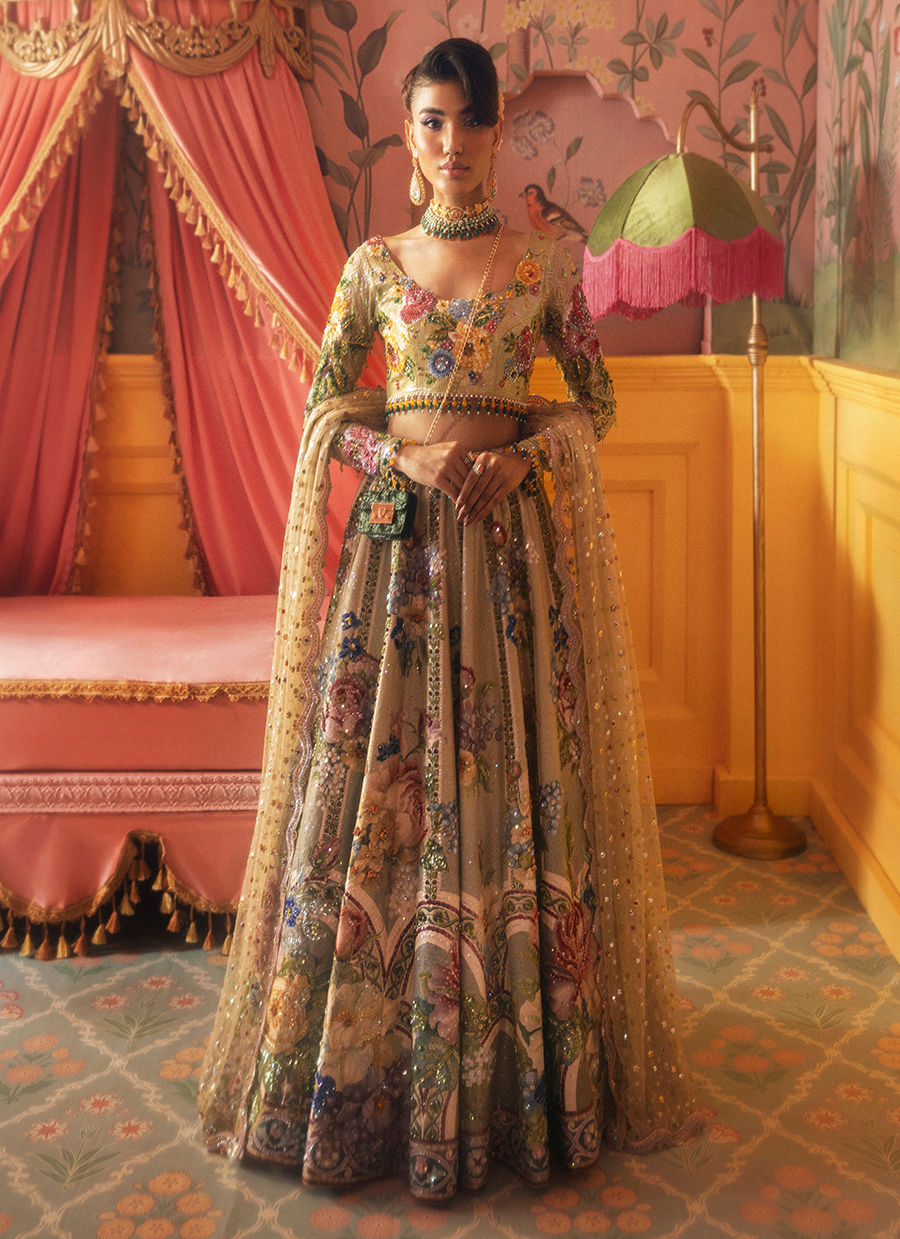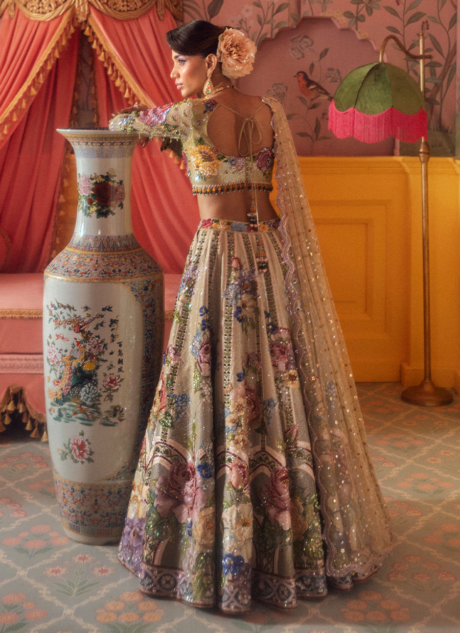 Vibrant summer blooms dance across this stunning lehenga, adorned with oversized floral motifs. Perfect for daytime weddings or mehndi celebrations.