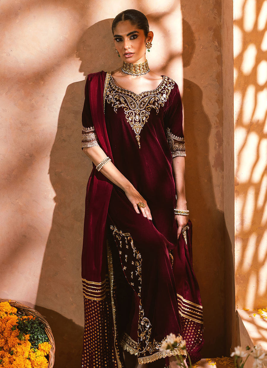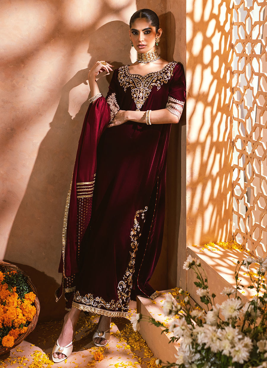 Long silhouette shirt in a rich maroon hue, crafted from velvet fabric and featuring traditional zardozi embellishments along the neckline. The side slits are elegantly enhanced with dangling tassels, complemented by zardozi detailing at the hemline. This ensemble is accompanied by a chiffon dupatta, adorned with sequins that catch the light on each pallu. The outfit may be paired with straight matching trousers to achieve a sophisticated festive appearance.