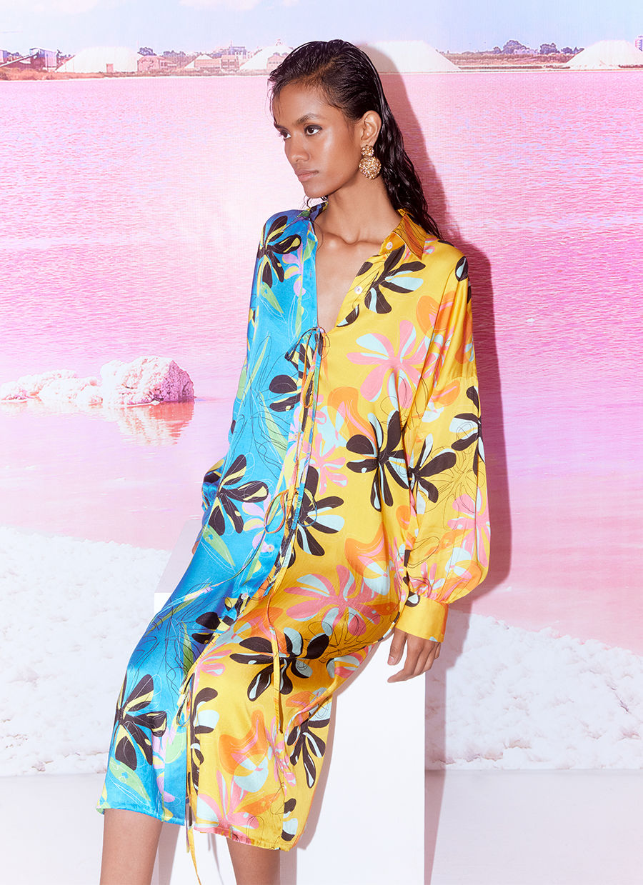 The Dahlia Half and Half Shirt Dress crafted from our stunning vegan silk fabrication, trans-seasonal, is a statement piece. Made in our hand painted and then digitally enhanced Floral Dahlia print, this is a trend setting piece made in two different tones of the same print. Featuring knots on the front placket this piece has a casual shirt dress fit and has contrast buttons on the front opening. It also has pleated sleeves. Pair it with heels for an elegant look.