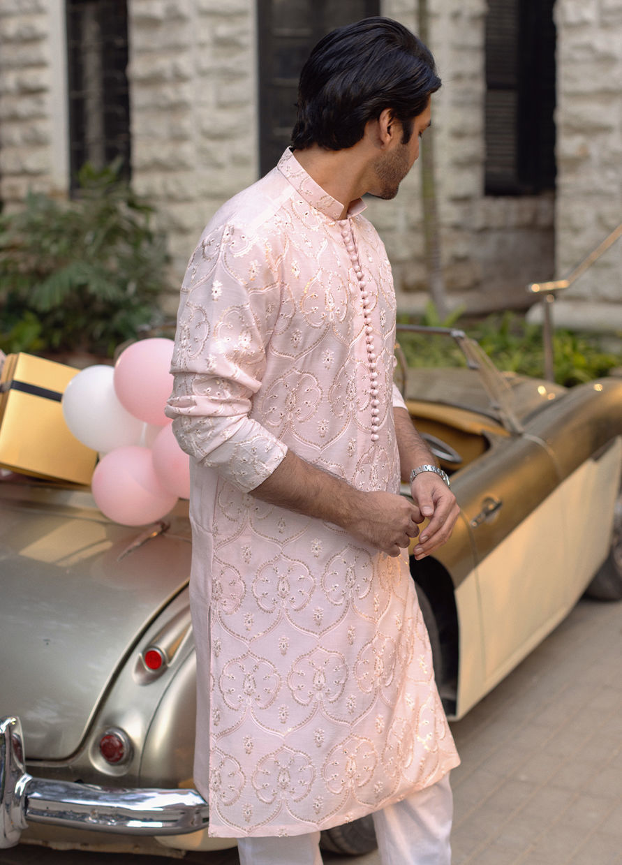 Cotton net kurta featuring schiffli details in powder pink hues. The neckline is adorned with loop details and the kurta can be paired with straight cotton pants to complete the look.