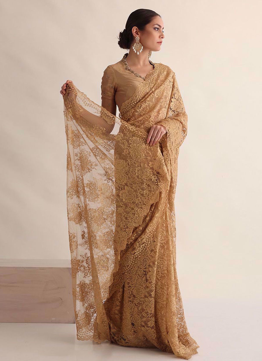 This six yards of splendour neutral gold Chantilly stitched saree with pure raw silk same coloured blouse, beautified with resham, zari, naqshi, dabka and tikki stones on sleeves, front neckline and back of the blouse is the perfect selection for any wedding event.