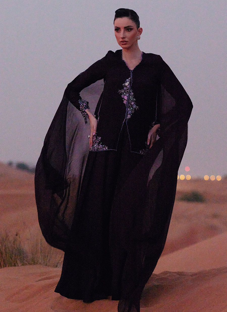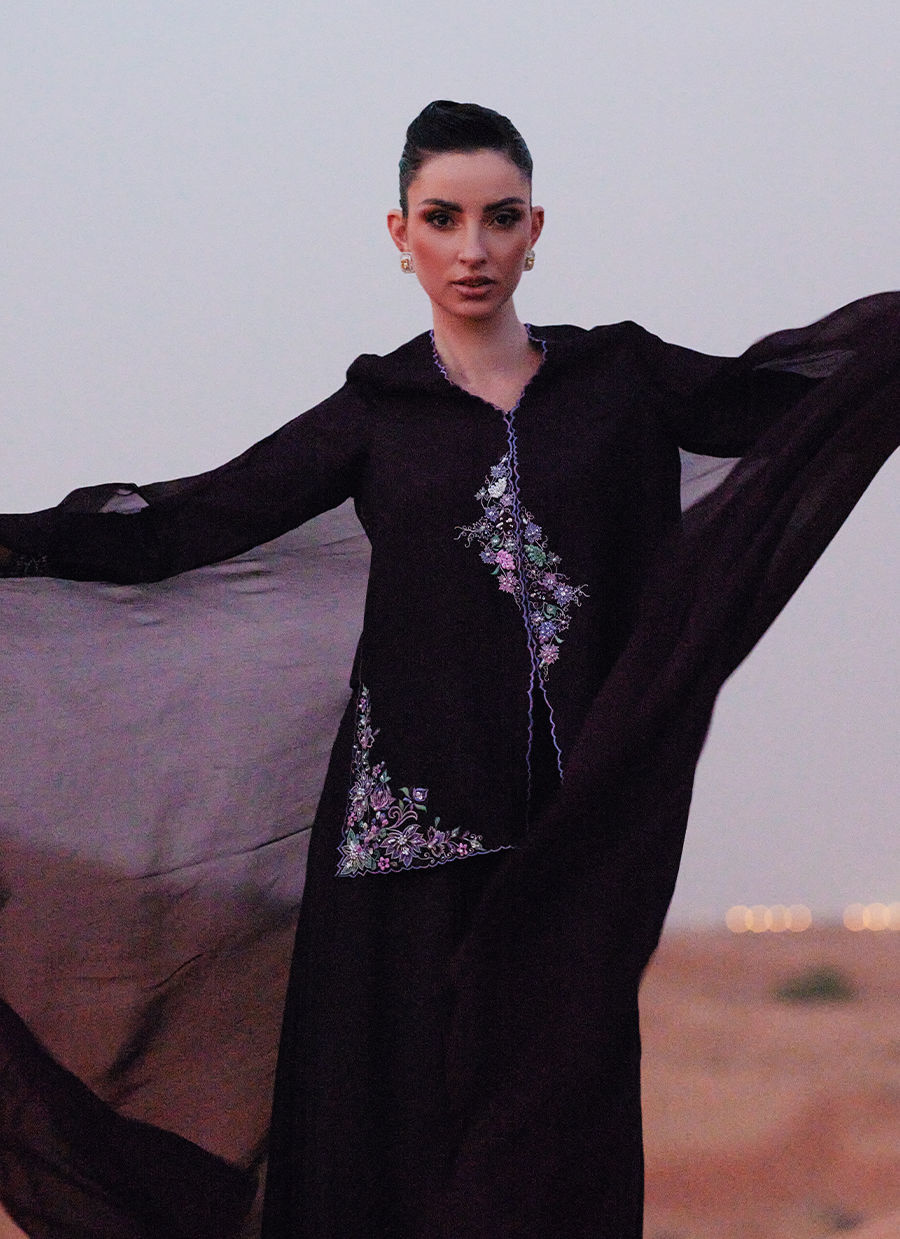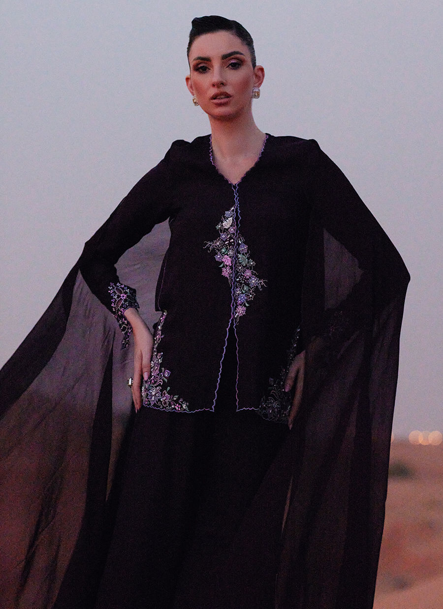 A front-open jacket crafted in Korean silk, adorned with vibrant embroidery and intricate hand embellishments throughout. Detailed with cutwork sleeves for added texture and dimension. Paired with an ombré-dyed KP silk scarf, adding a soft, fluid finish to the look.