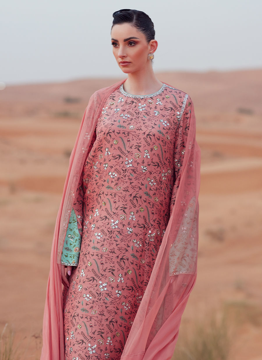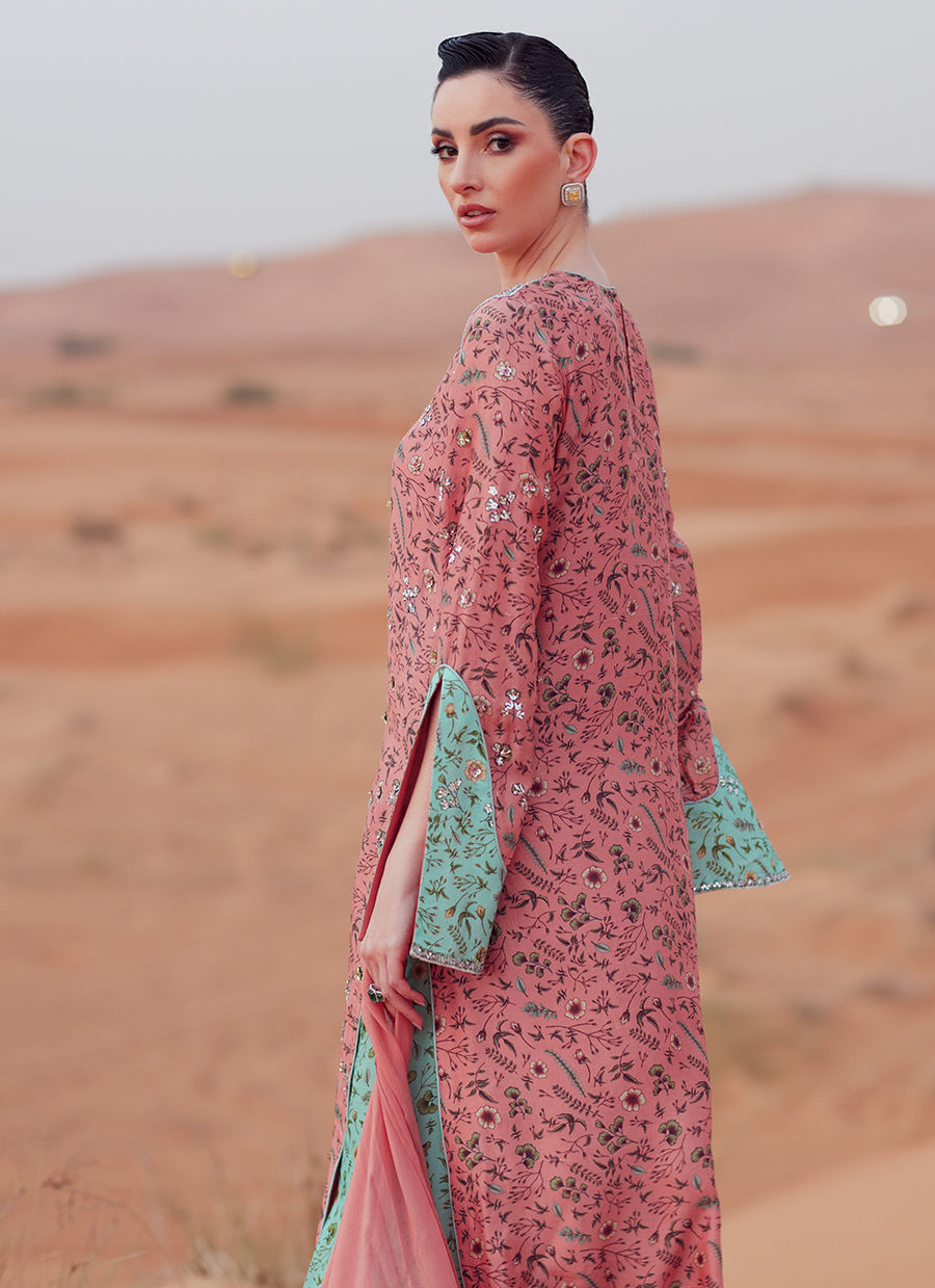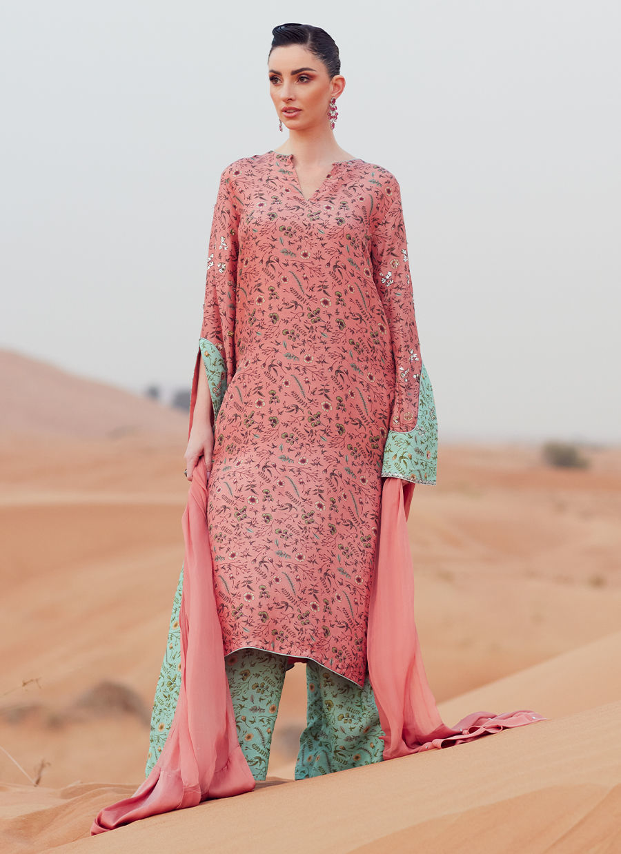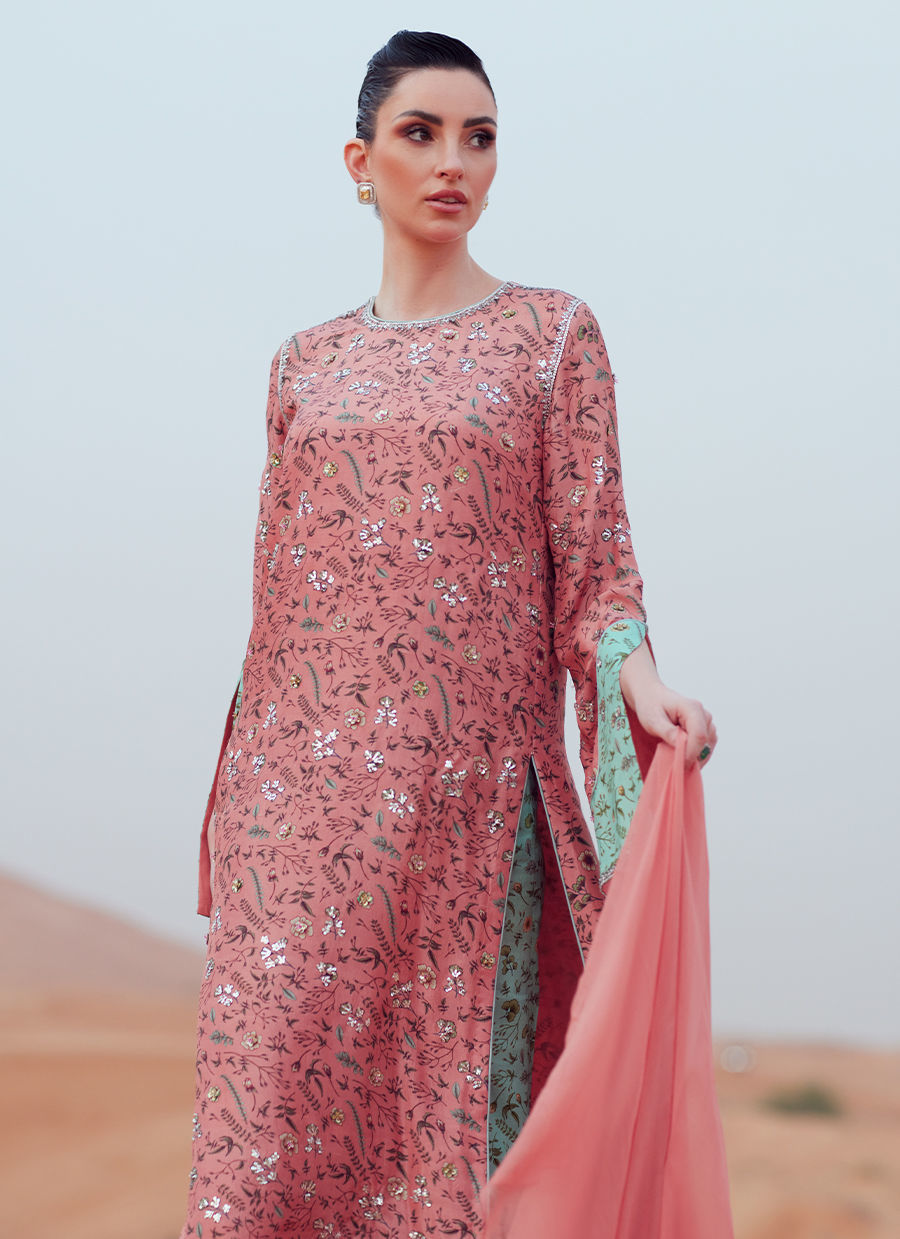 A long shirt crafted from pure raw silk, digitally printed and detailed with accent-color sleeve patches. Hand embellishments adorn the shirt and sleeves all over, adding refined texture and detail. Paired with PK raw silk wide-leg pants for a balanced, modern silhouette. Completed with a chiffon dupatta, finished with sequin embellishment on the pallus for a subtle, elegant sheen.