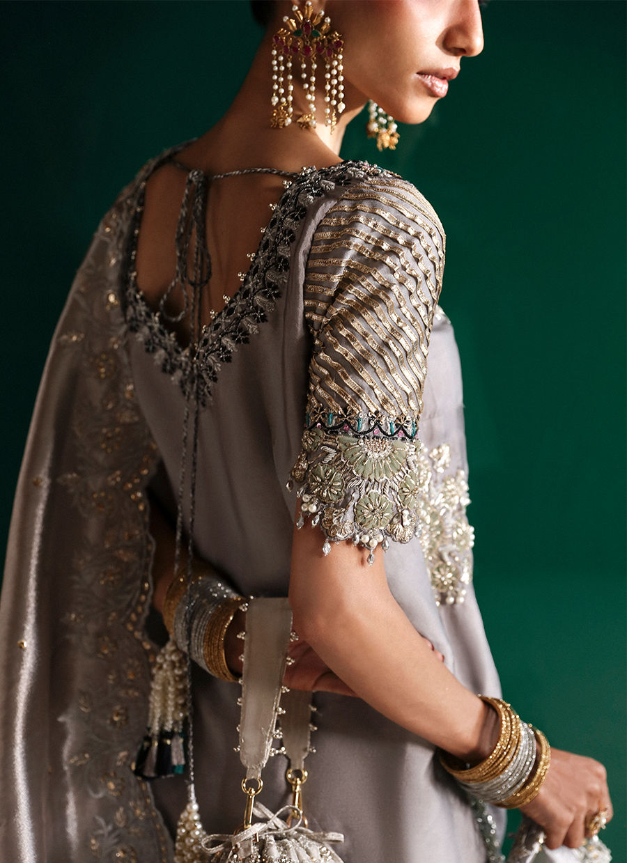 Includes: Shirt with Gharara A luxurious grey shirt & gharara featuring a hand-embellished tissue silk shirt with intricate dabka, nakshi, swarovski's, pearls, and resham thread work. The sleeves showcase an embroidered, embellished border with gota patti details, while the chiffon gharara is finished with a delicate embroidered border and lappa. Paired with a pure tissue dupatta, meticulously embroidered and hand-embellished to complement the richness of the outfit. A timeless statement crafted for the bride or her closest circle.