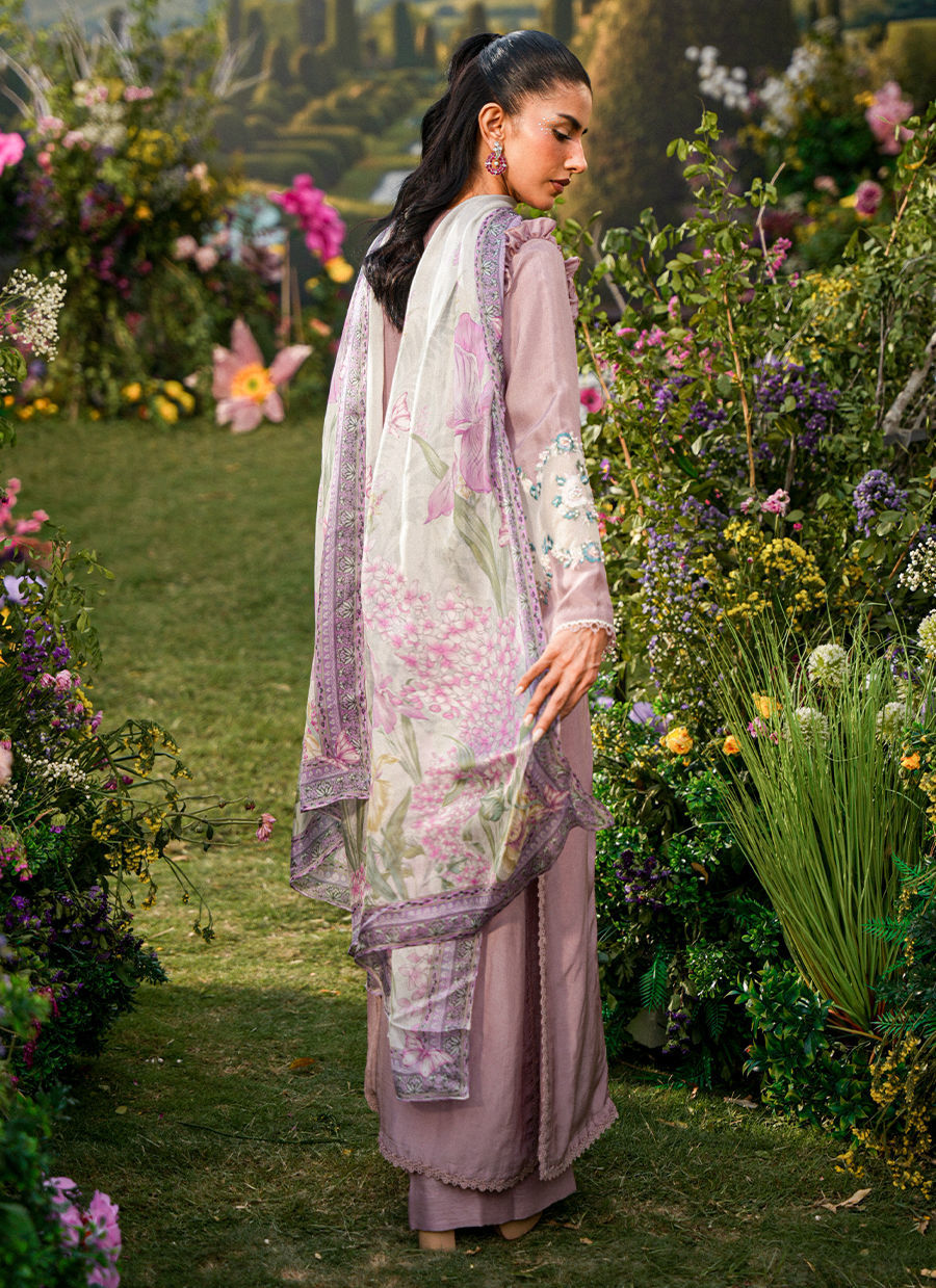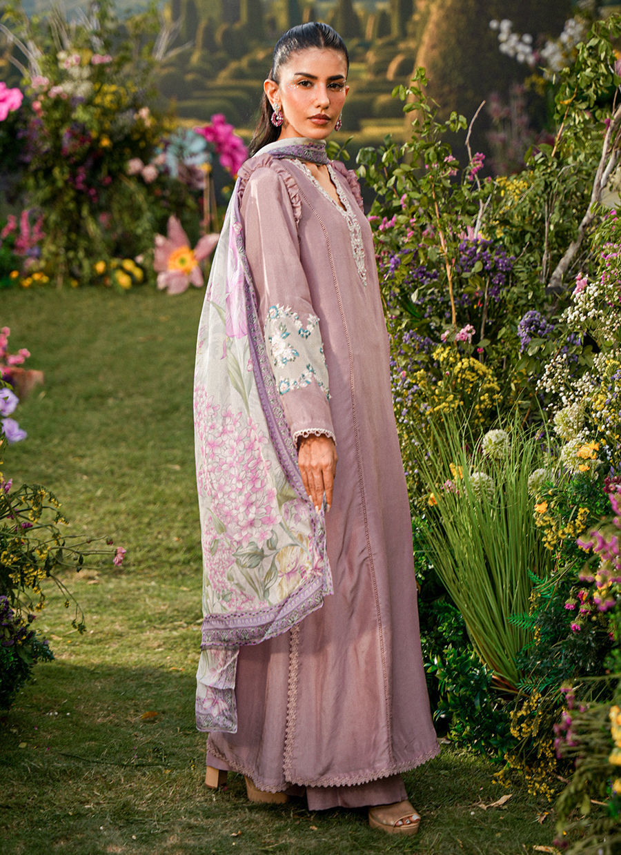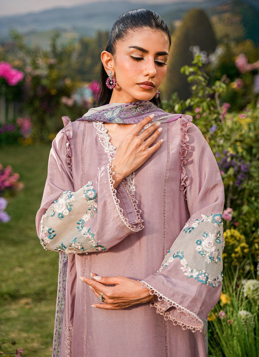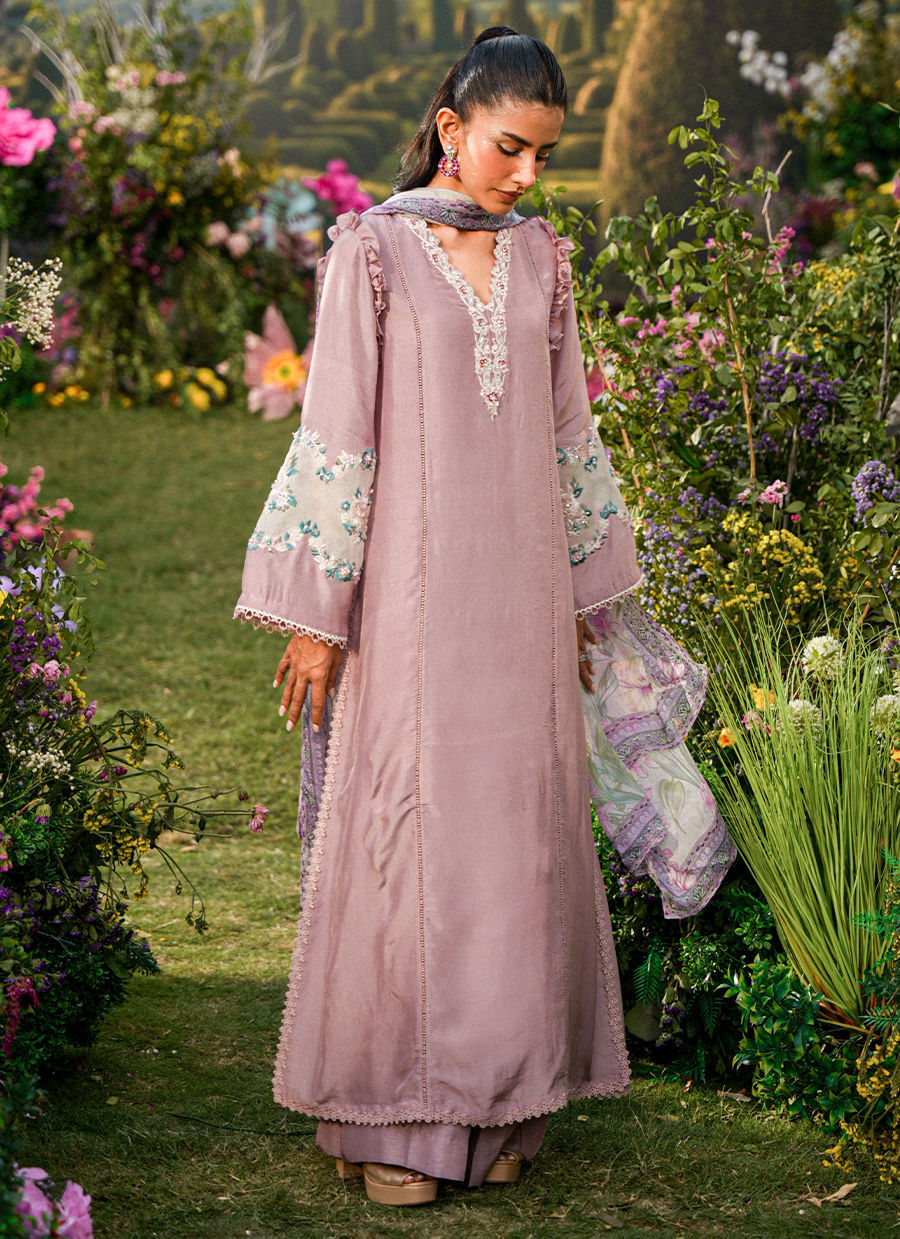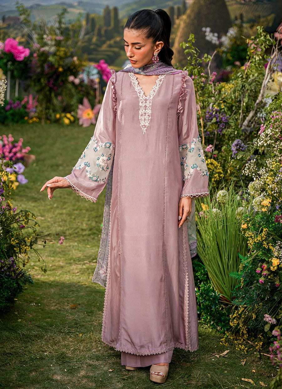 A graceful long shirt in a rich mauve hue, designed with a flattering V neckline adorned in intricate, hand-finished embroidery that flows seamlessly onto the sleeves. The delicate ruffle detailing at the sleeve hems adds a soft, romantic movement, enhancing the femininity of the silhouette. Paired with sleek straight pants, the ensemble strikes a perfect balance between structure and fluid elegance.