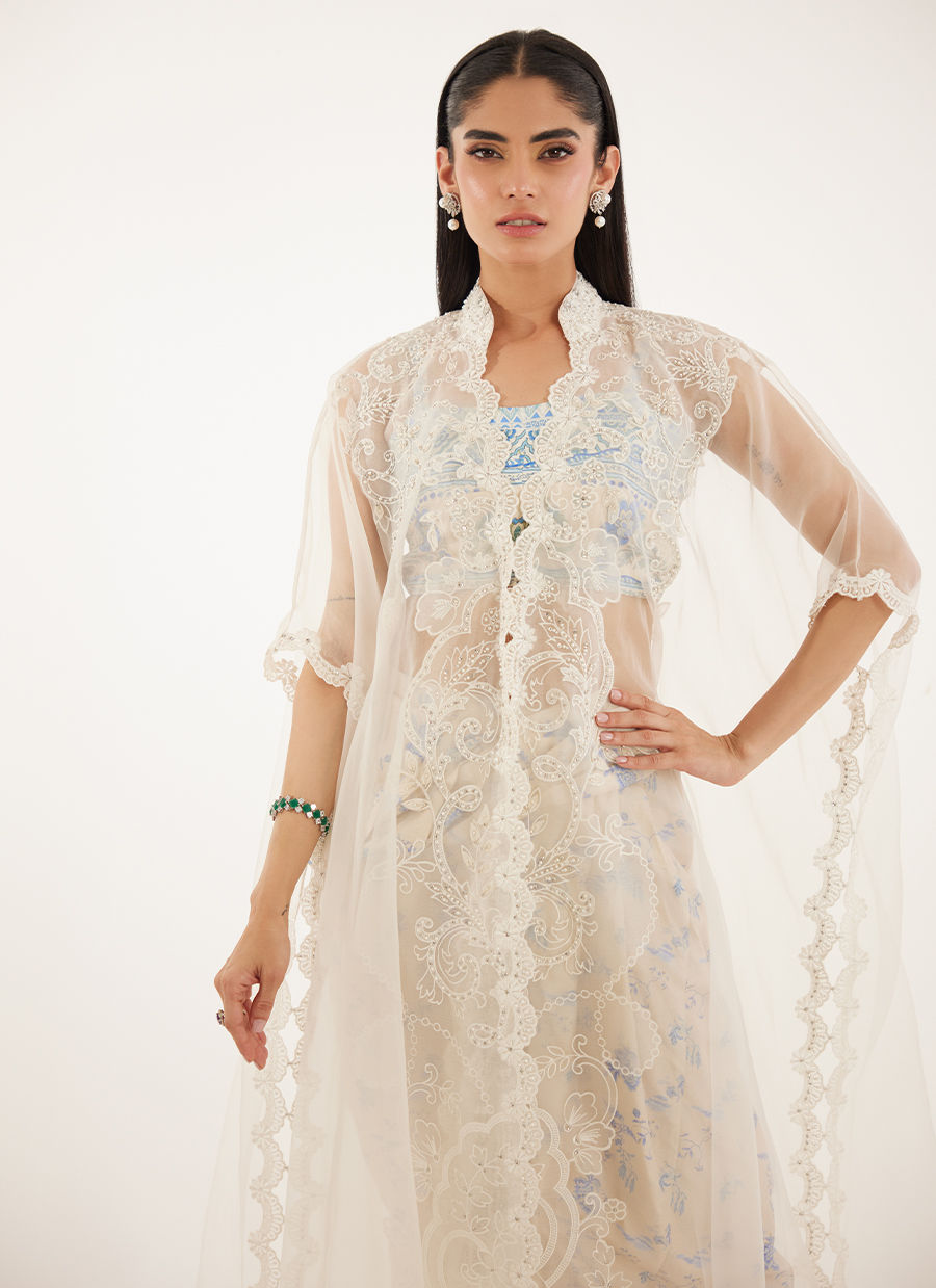This refined ensemble features a delicately embroidered sheer overlay layered over a softly printed base, creating a silhouette that is both graceful and fluid. The intricate embroidery unfolds across the fabric like fine lace, adding depth, texture, and couture sophistication.