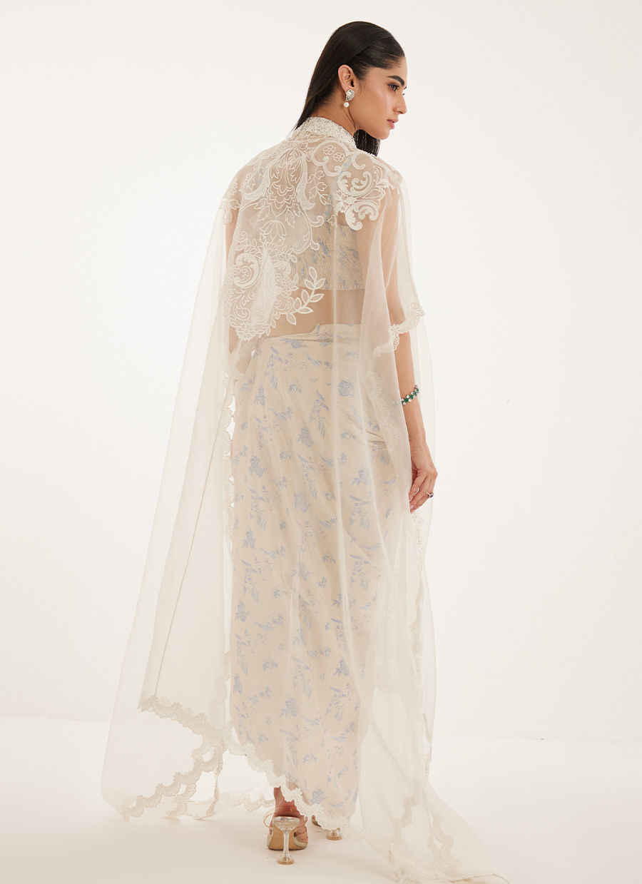 The look is elevated with a dramatic cape-style sheer layer, edged with delicate scalloped detailing that cascades beautifully, bringing movement and a sense of soft grandeur. Beneath, the subtle printed base adds a hint of color and dimension, perfectly balancing the sheer elegance above.