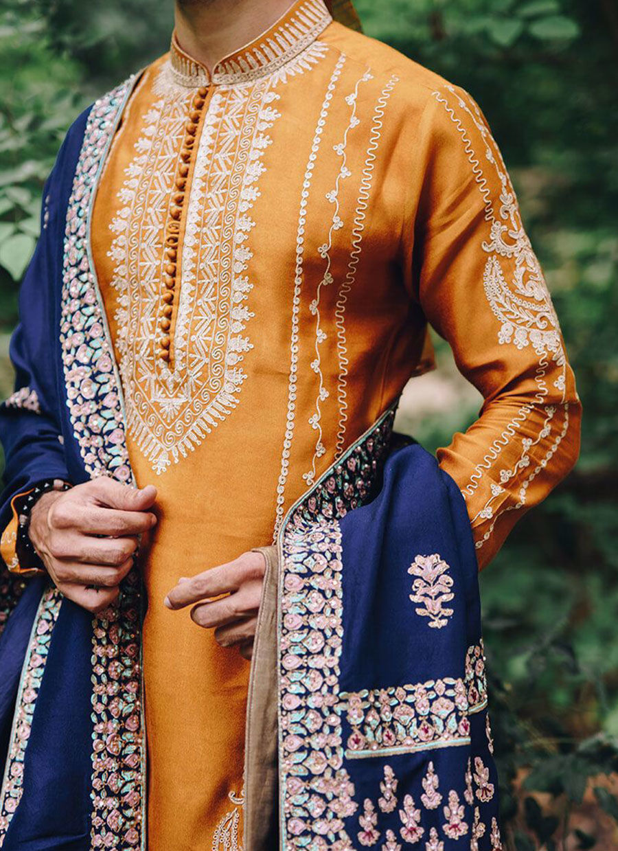 Nabeel wears dilawar, a class apart. A 2 piece attire consists of a heavily vintage embroidered orange kurta pajama is worn with a divine hand block print and embellished shawl set on a blue raw silk.