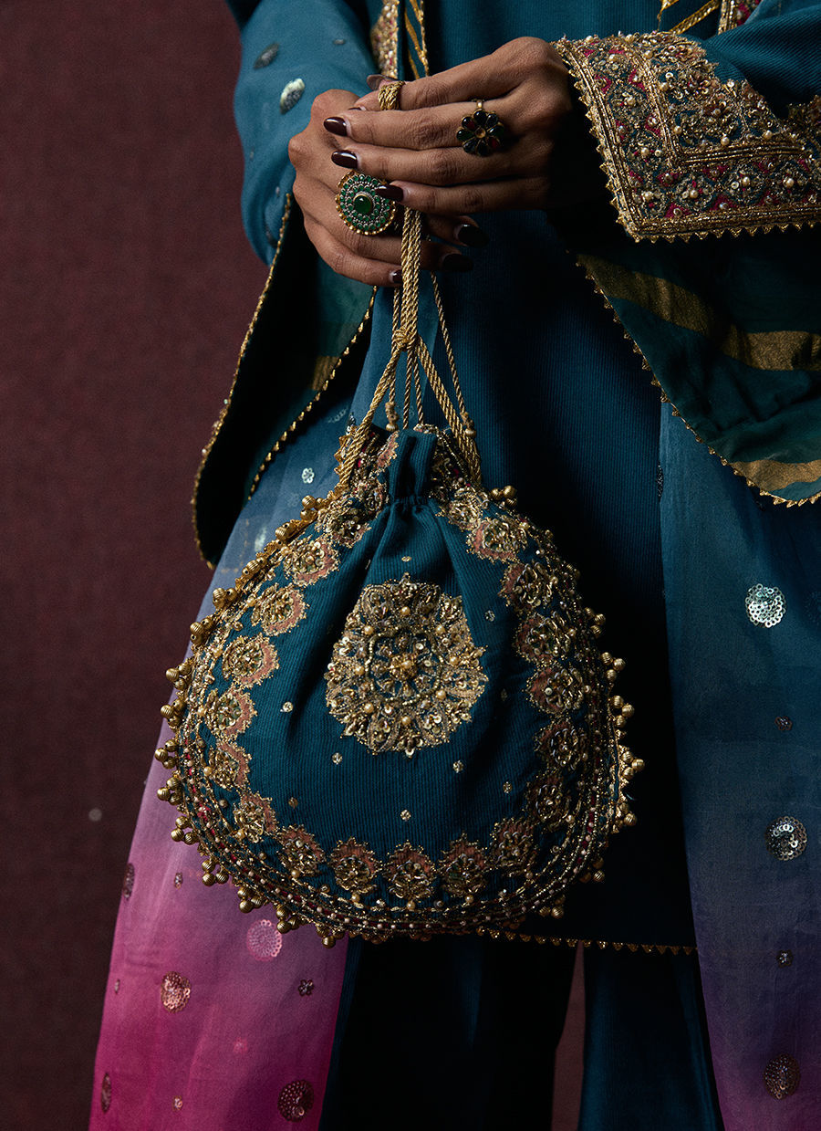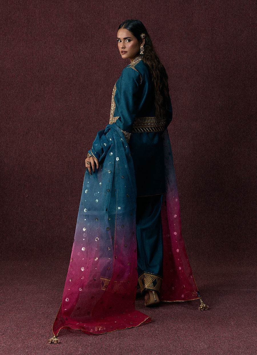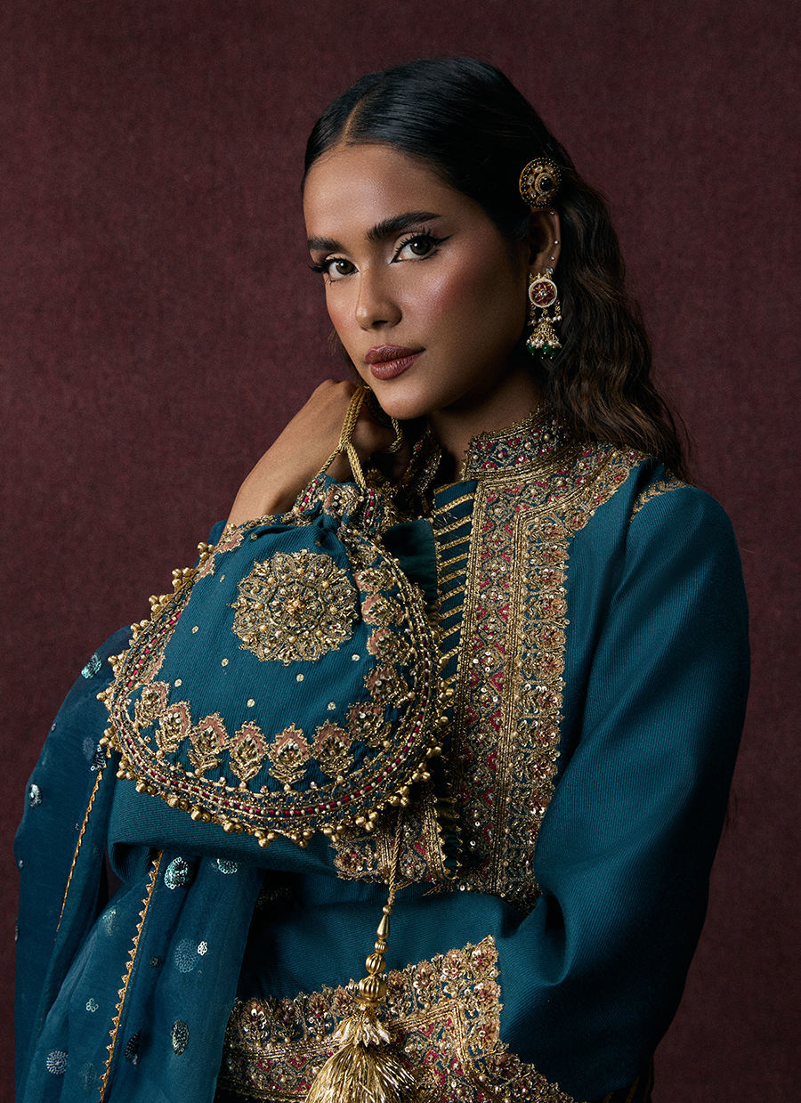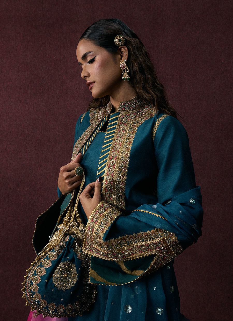 A teal blue shalwar kameez paired with a gota-bordered shalwar and a block-printed embroidered jacket adorned with intricate adda work. The look is completed with a tie-dye organza dupatta for a contemporary festive finish.