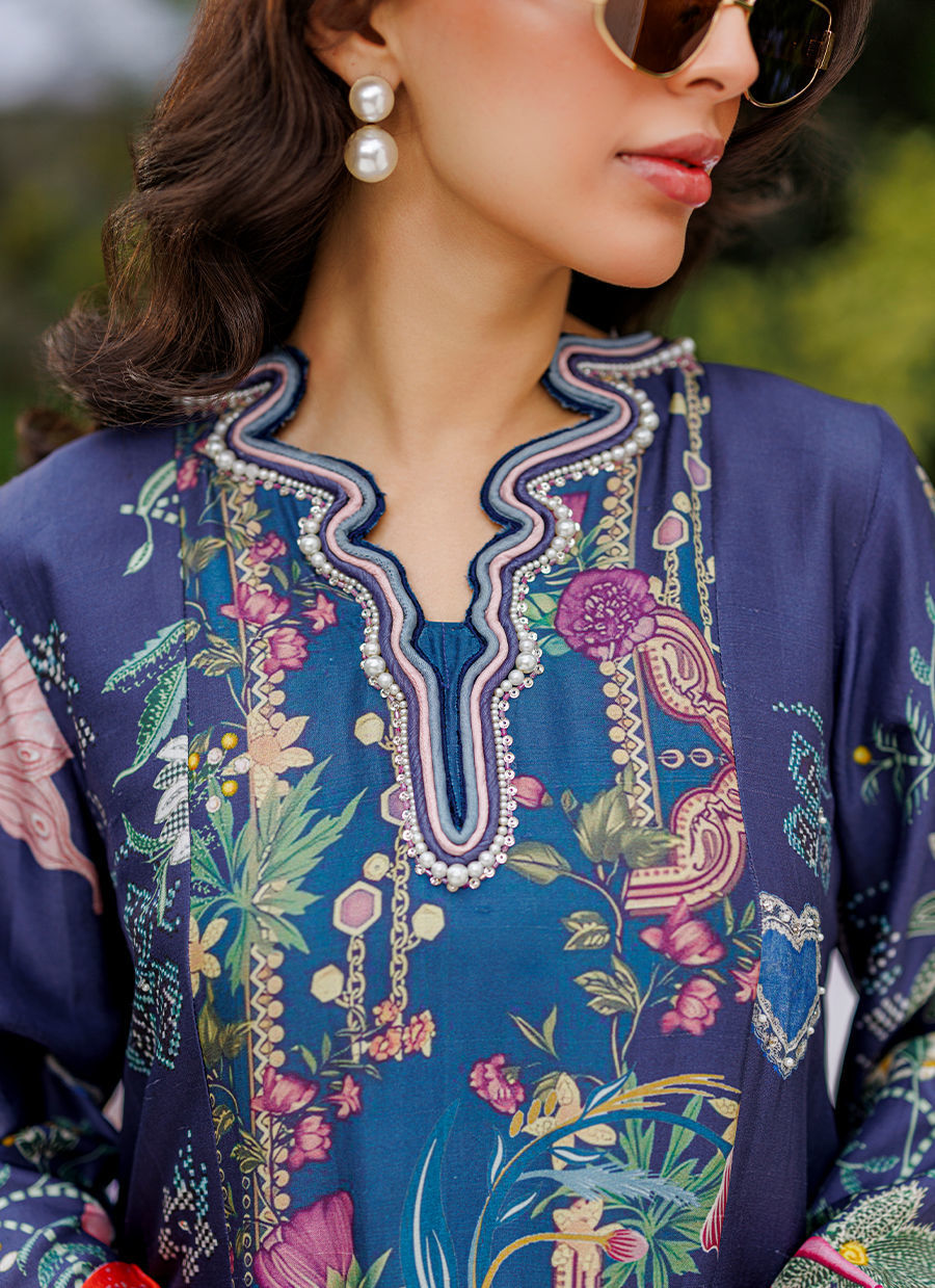 A regal blue raw silk kaftaan featuring a classic kaftaan cut, adorned with pearly embellishments and intricate dori work along the neckline and folded cuffs, creating a sophisticated and timeless silhouette. *Model is 5'5" and is wearing a size extra small.