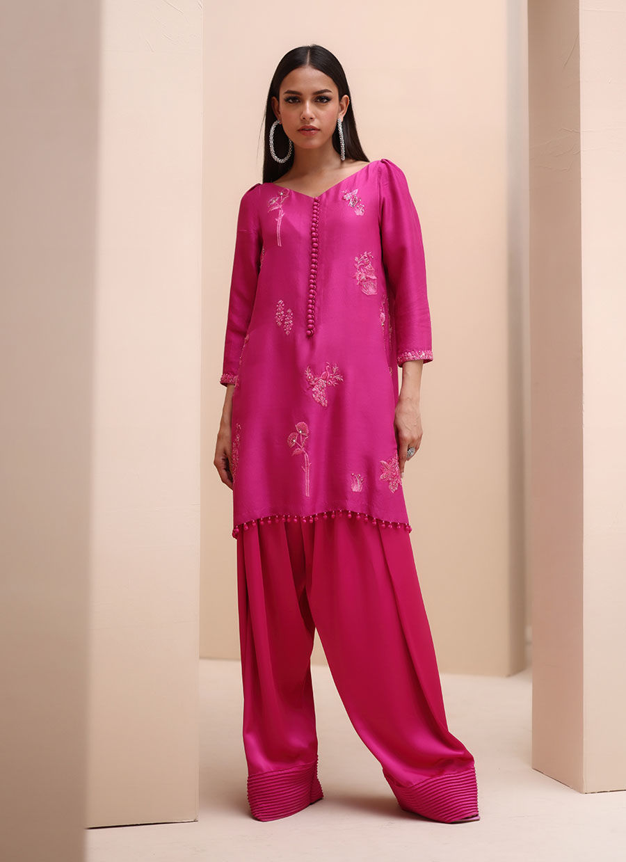 Radiant Elegance in Fuchsia Rose – This exquisite ensemble features a Pure Raw Silk Shirt, Crepe Silk Shalwar, and a delicate Pure Organza Dupatta. Adorned with all-over self-Resham embroidery, it showcases intricate handwork with Moti, Tikki Stones, Sequins, Cutdana, and handmade hangings on the daman. The shalwar features elegant Pintex detailing on the bottom, while the dupatta is beautifully enhanced with Resham embroidery and delicate cutwork on the pallu, creating a perfect blend of sophistication and craftsmanship.