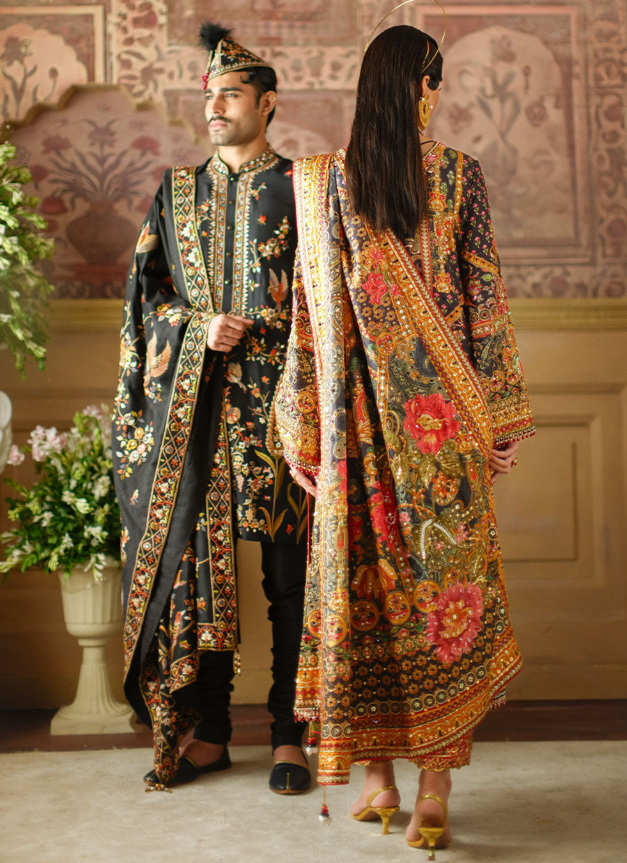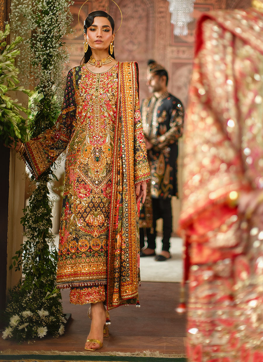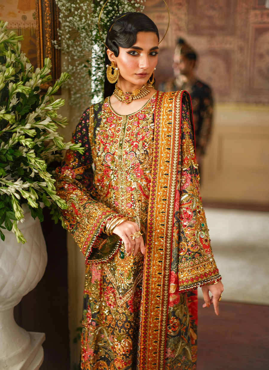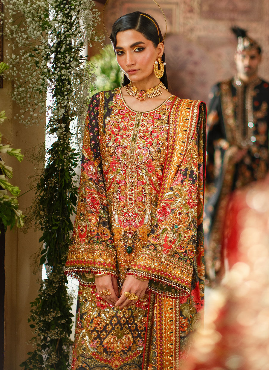 This exquisitely designed long shirt unfolds as a tapestry of rich hues and masterful craftsmanship. With tones of pink, amber and emerald, it showcases intricate detailing, complete with a matching ezaar and dupatta.
