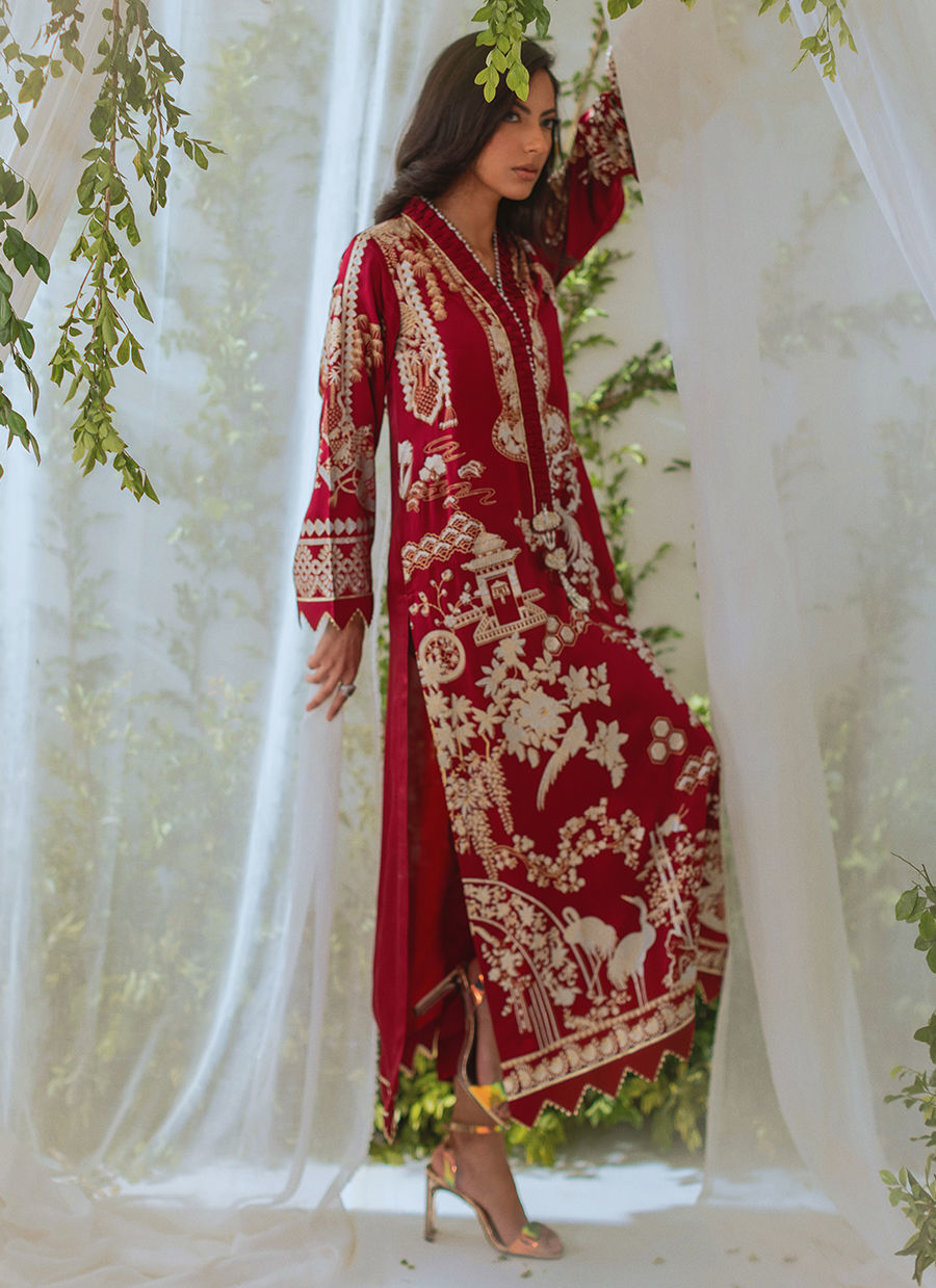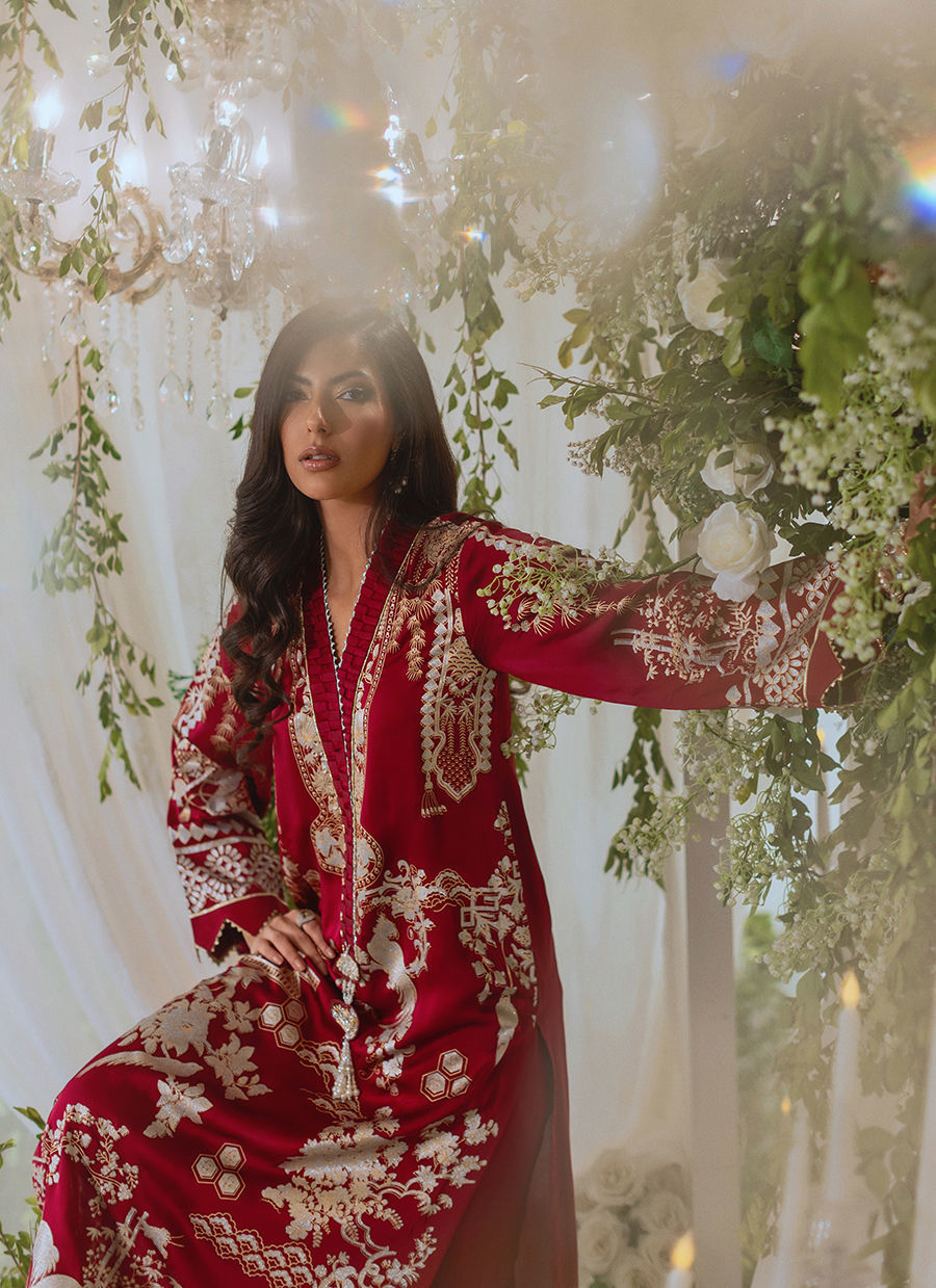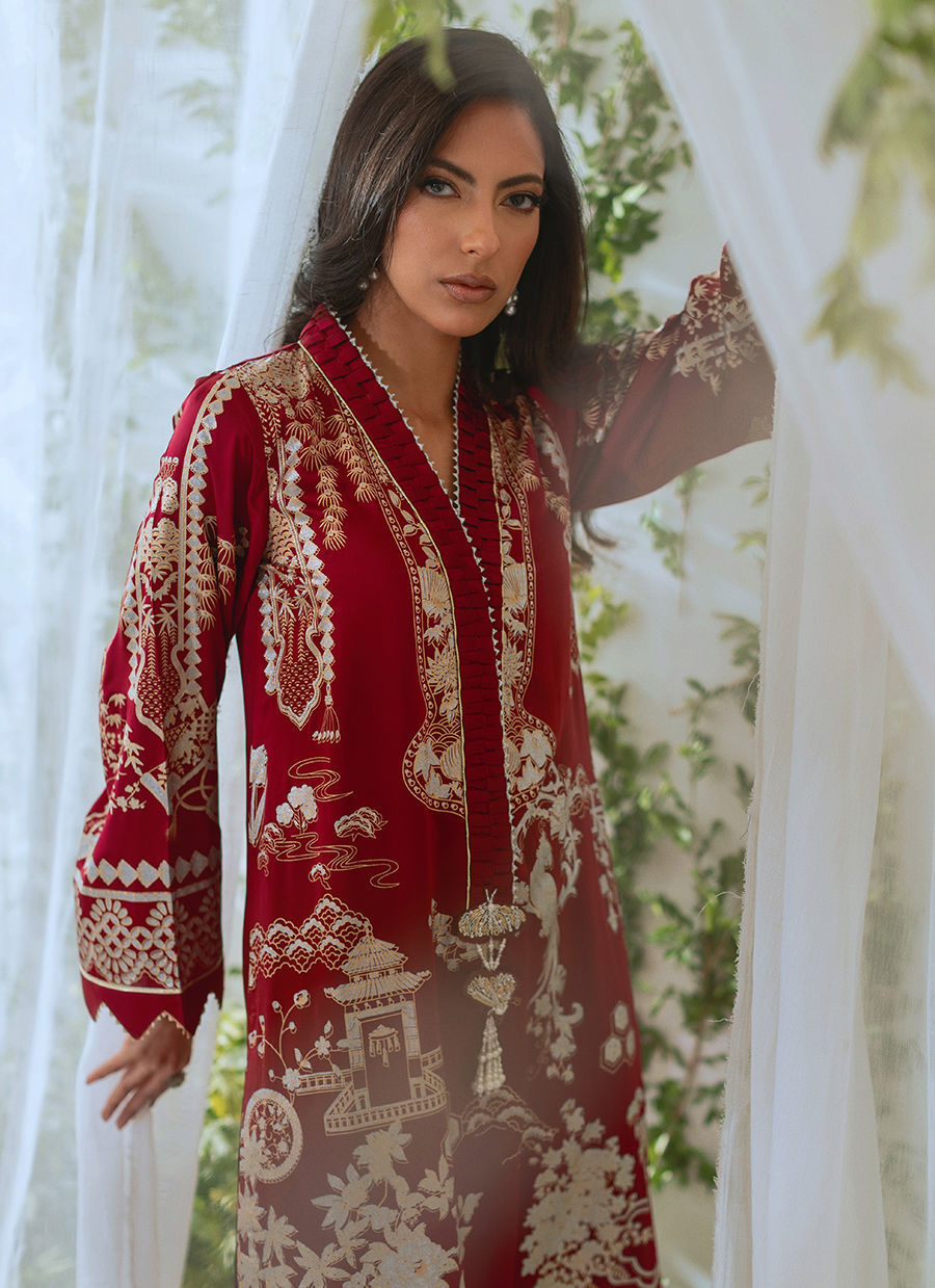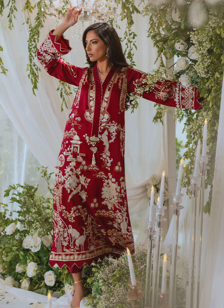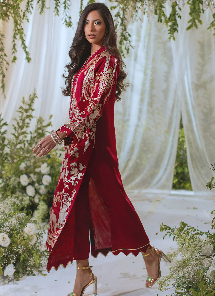 Long silhouette shirt in deep cranberry on silk canvas featuring silver and gold composed screen printed details. The neckline is enhanced with fabric manipulation details adorned with handcrafted dangling tassels. The shirt comes with matching straight pants.