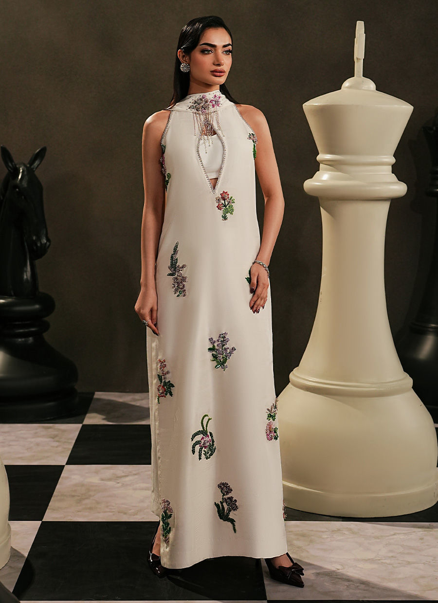 A look that fits effortlessly into our festive wardrobe.Pure Silk/ Tussel Silk gives EIRA its ease, while the keyhole neckline adds quiet character. Cut dana floral work appears delicately across the shirt, offering just enough ornament without feeling heavy. Straight trousers keep the look grounded, and the skinny pleated dupatta, finished with a soft motif, brings movement and lightness.