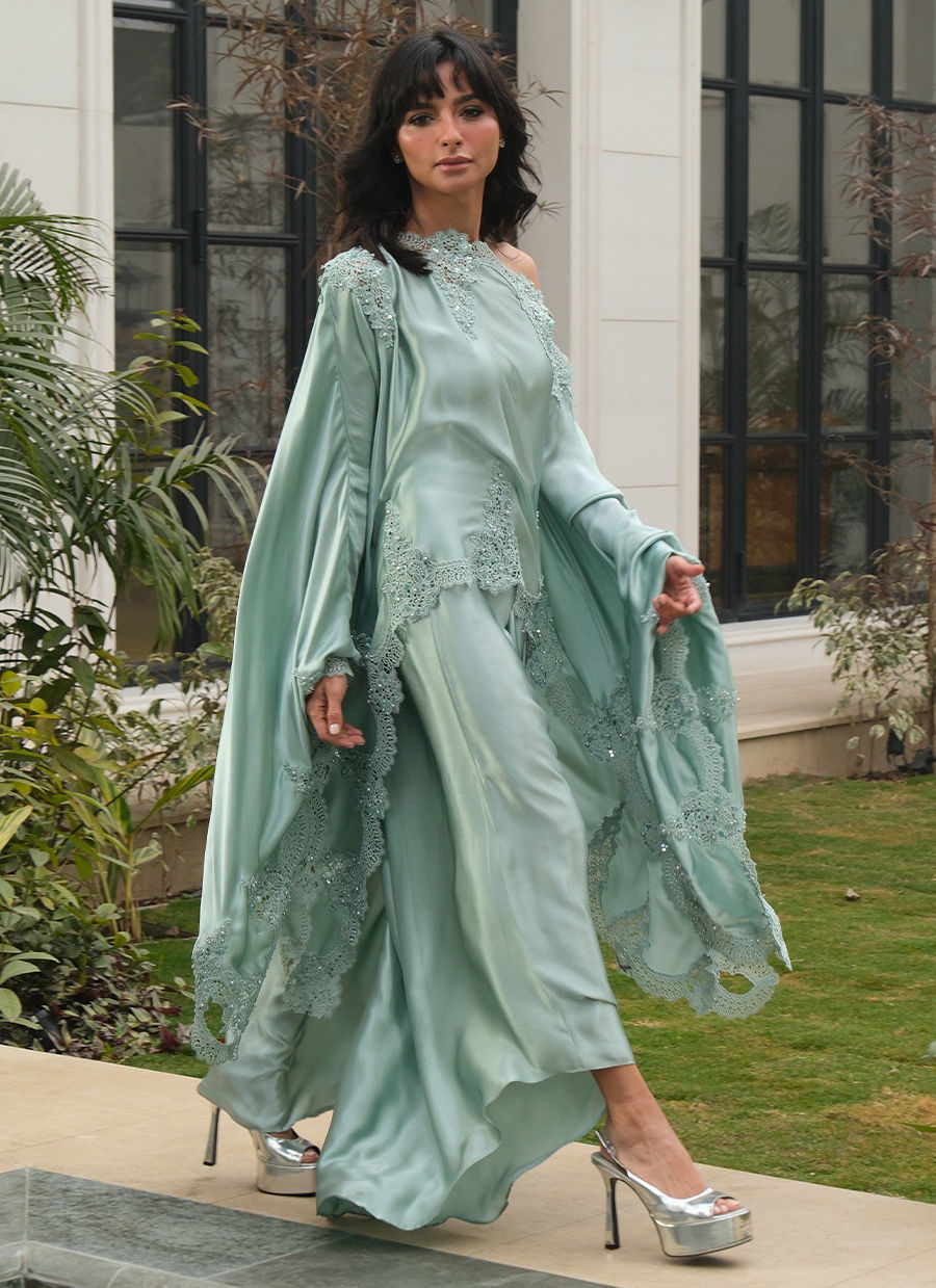 Crafted from pure satin silk, Eirene is an ode to fluid elegance and modern glamour. The ensemble features a flowing cape silhouette, edged with appliquéd lace hand embellished with crystals and sequins, creating a delicate play of texture and light. Beneath, a softly pleated skirt-pant falls effortlessly, offering movement, comfort, and understated drama.