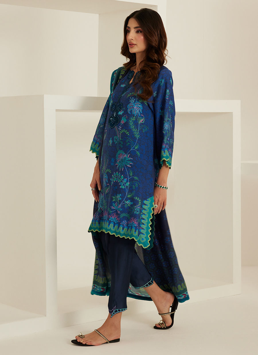 Deep, captivating, and effortlessly refined — Elfie shirt and dupatta is a celebration of bold elegance. Crafted in pure raw silk, the shirt is rendered in a rich midnight blue, adorned with intricate botanical prints in tones of teal and emerald that bring depth and quiet vibrance to the design.