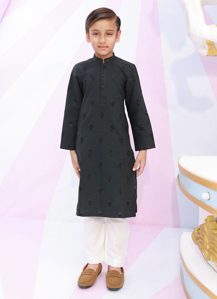A black self embroidered kurta on cotton with white bareeze cotton straight pants.
