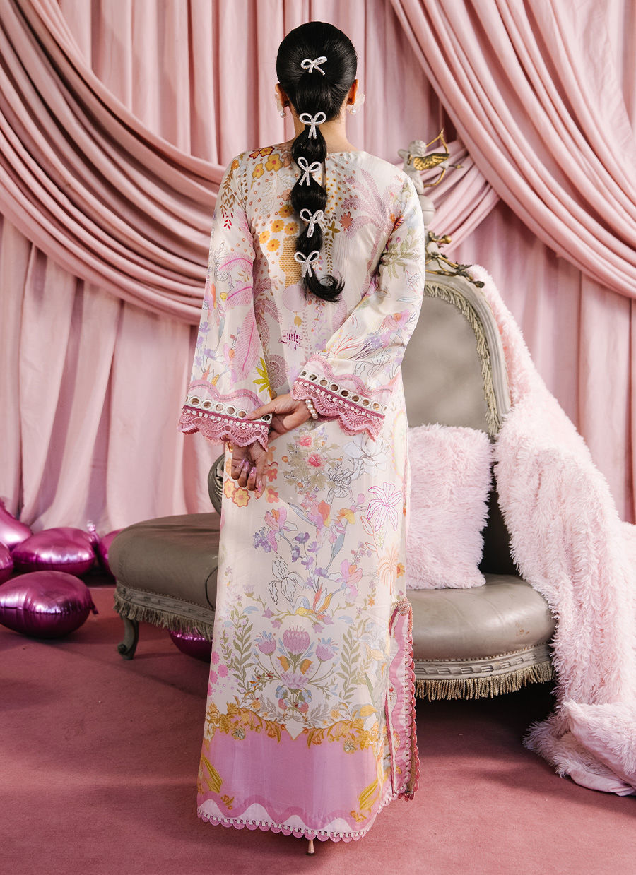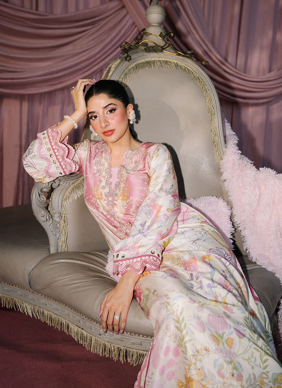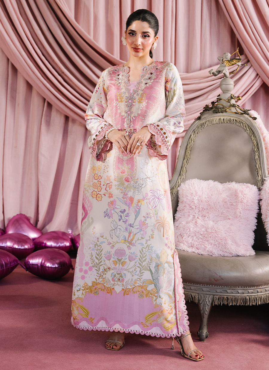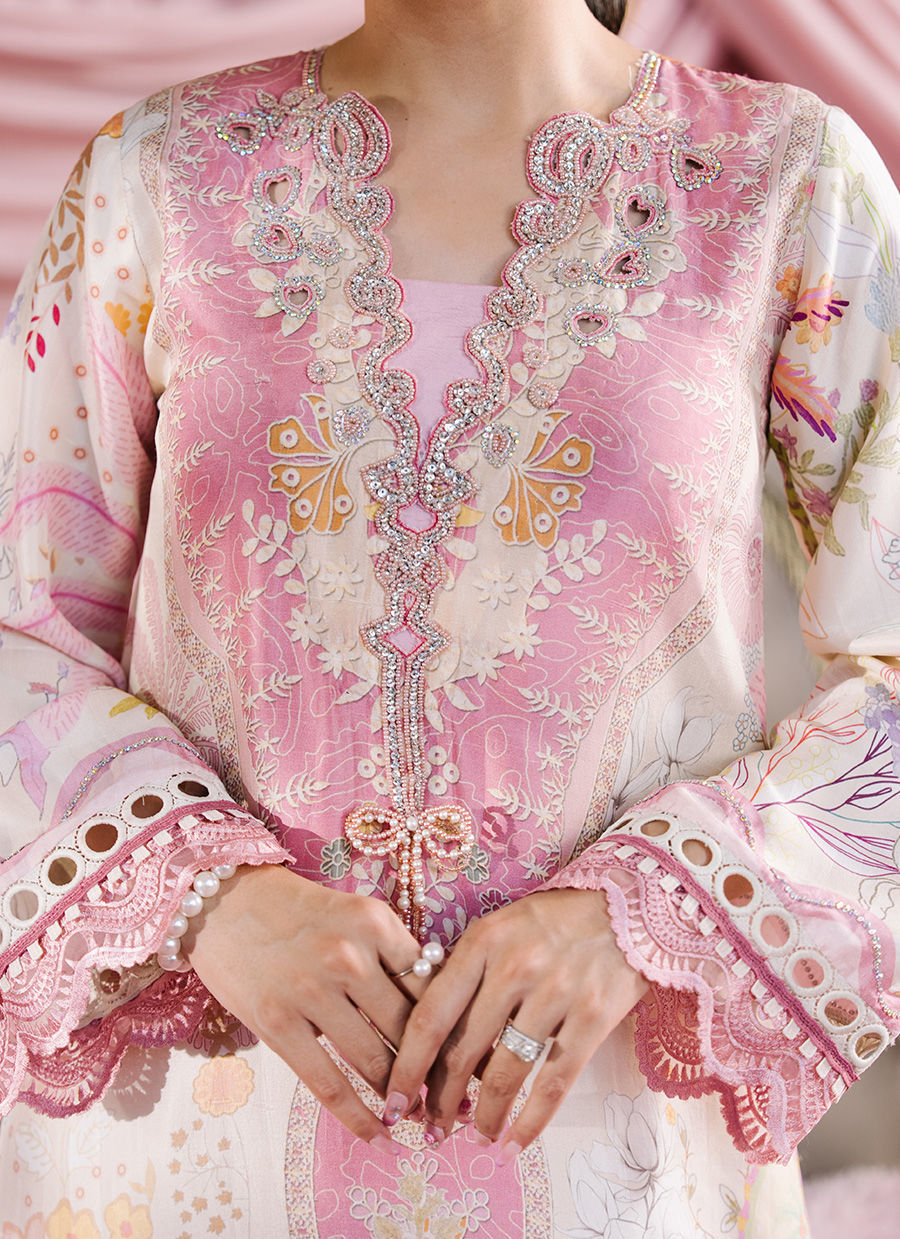 A graceful tea pink and beige printed kaftan, designed to flow effortlessly with an air of understated elegance. The neckline is delicately embellished with Swarovski stones, highlighted by intricate cutwork circles and heart motifs that add a playful yet sophisticated charm. Thoughtfully placed pearl accents and beaded bow tassels eleveate silhouette with subtle sparkle