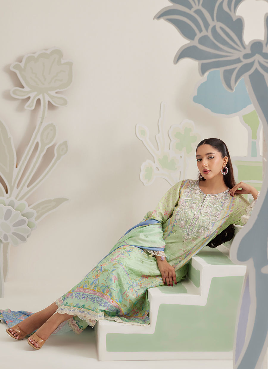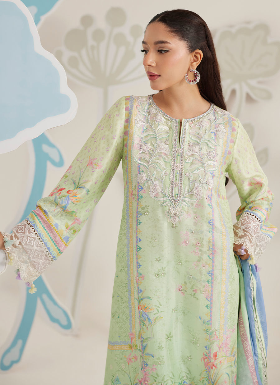 Styled with printed raw silk pants and completed with a printed medium silk dupatta, this ensemble is designed for elegant daytime occasions and intimate celebrations. Effortless yet considered, Elowen embodies Farah Talib Aziz’s signature balance of craftsmanship, femininity, and timeless appeal.