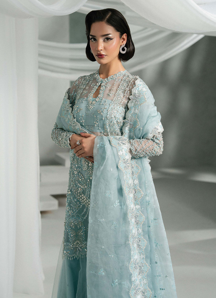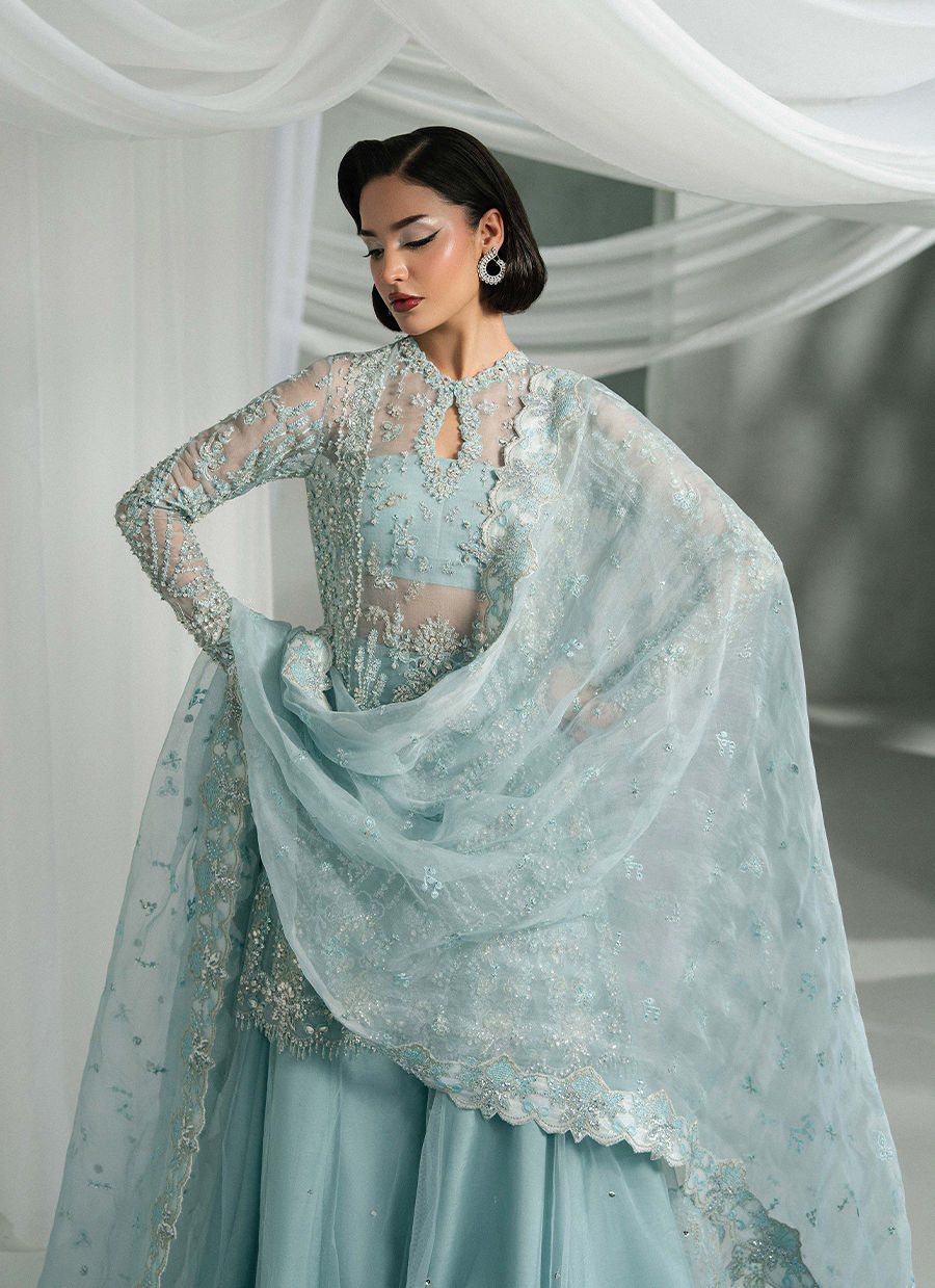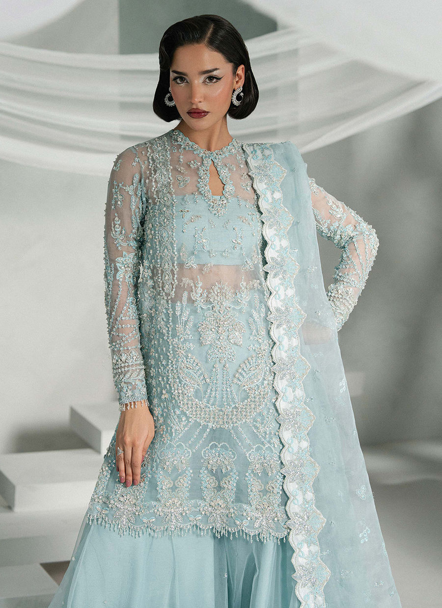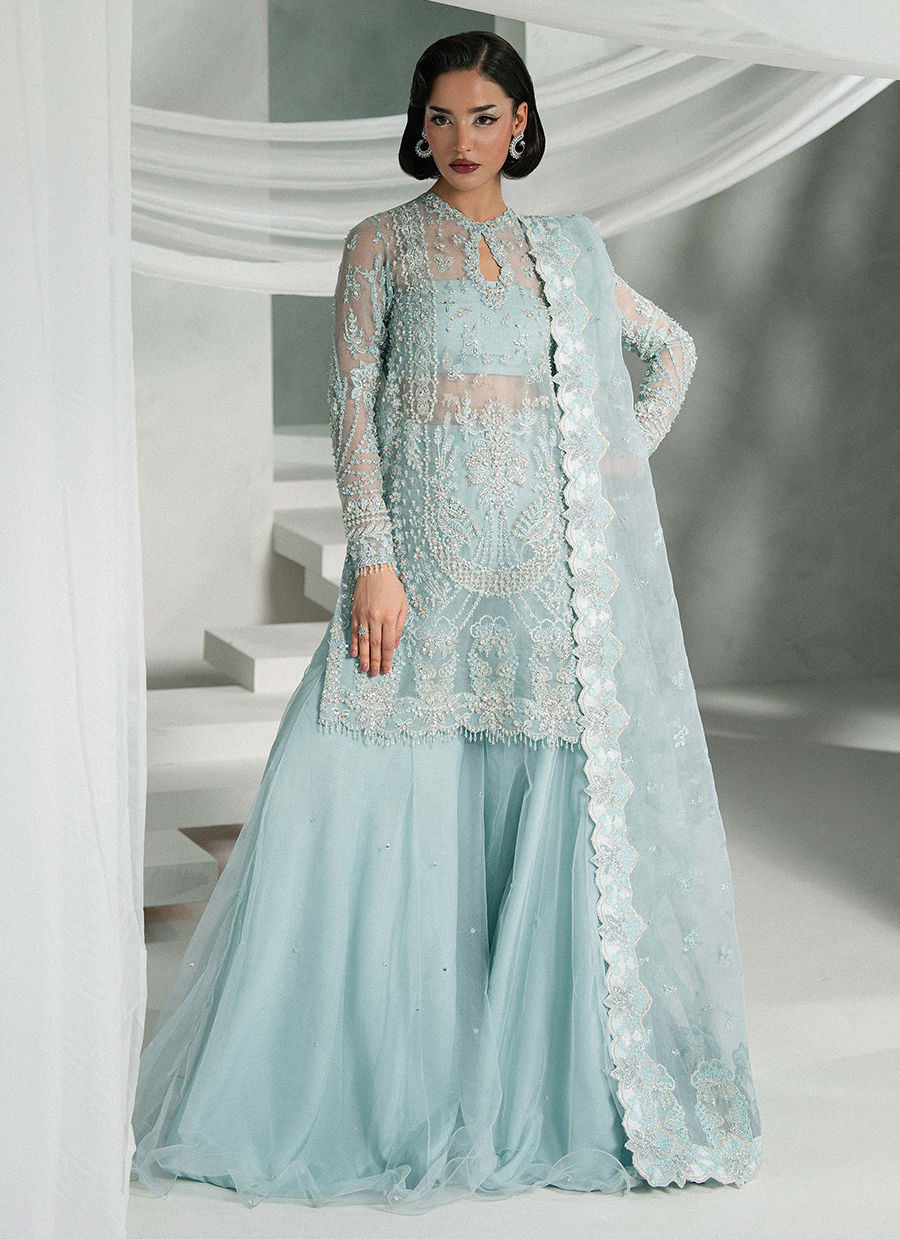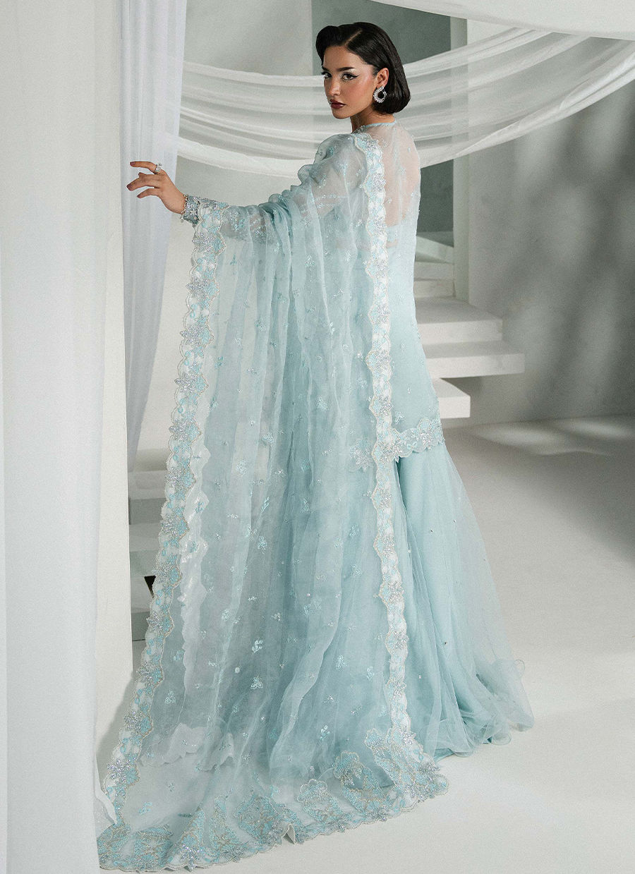 Elyra is a serene frozen blue ensemble featuring a short shirt with a keyhole neckline and intricate scalloped sleeves. Paired with flared net sharara pants Embellished with sequins. The dupatta has lama facing, spray detailing, and a heavy pallu perfect for you to have a spotlight at any occasion