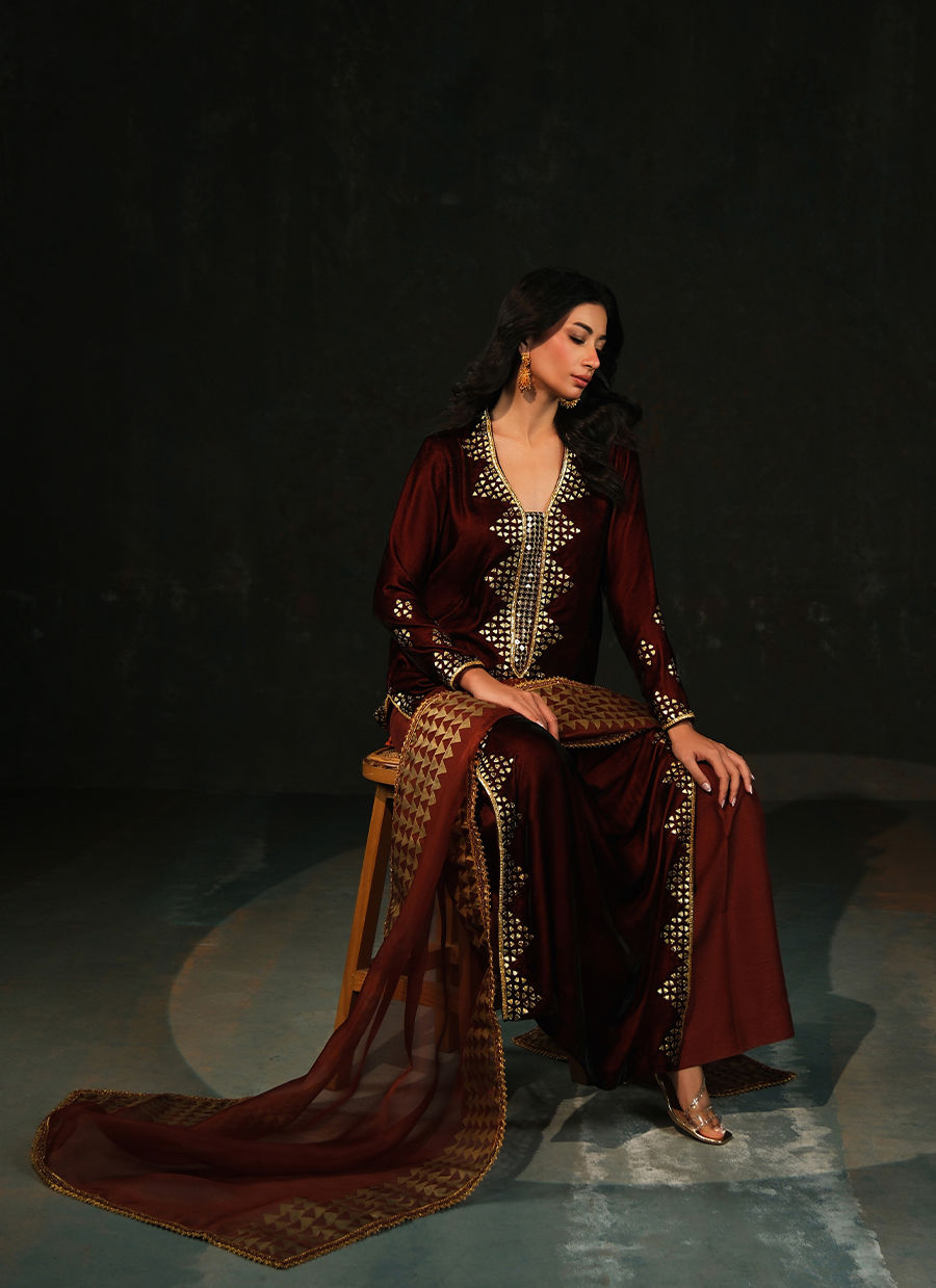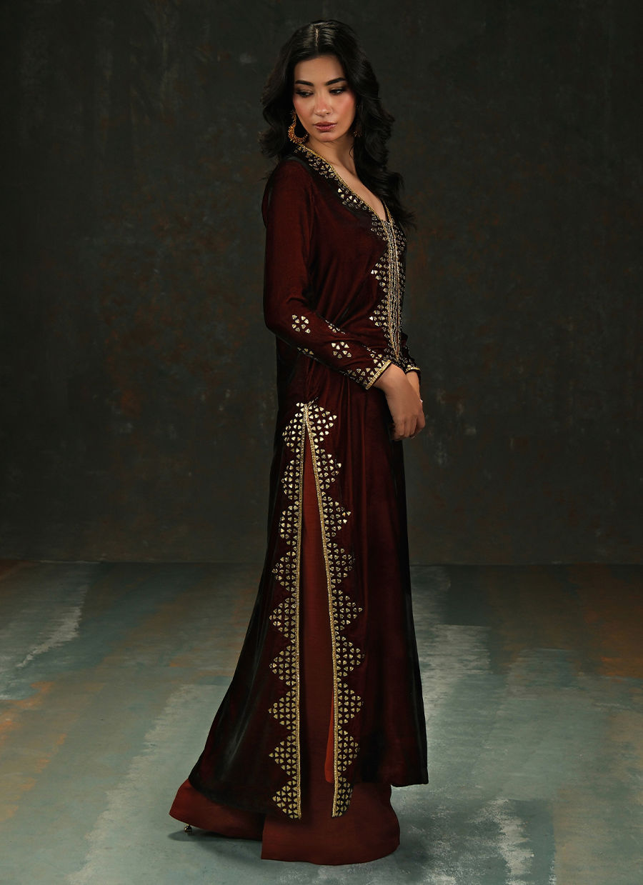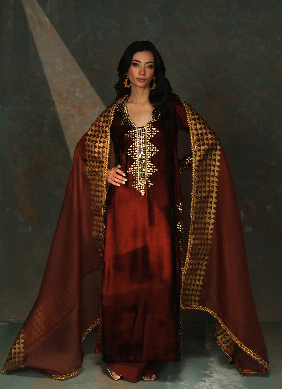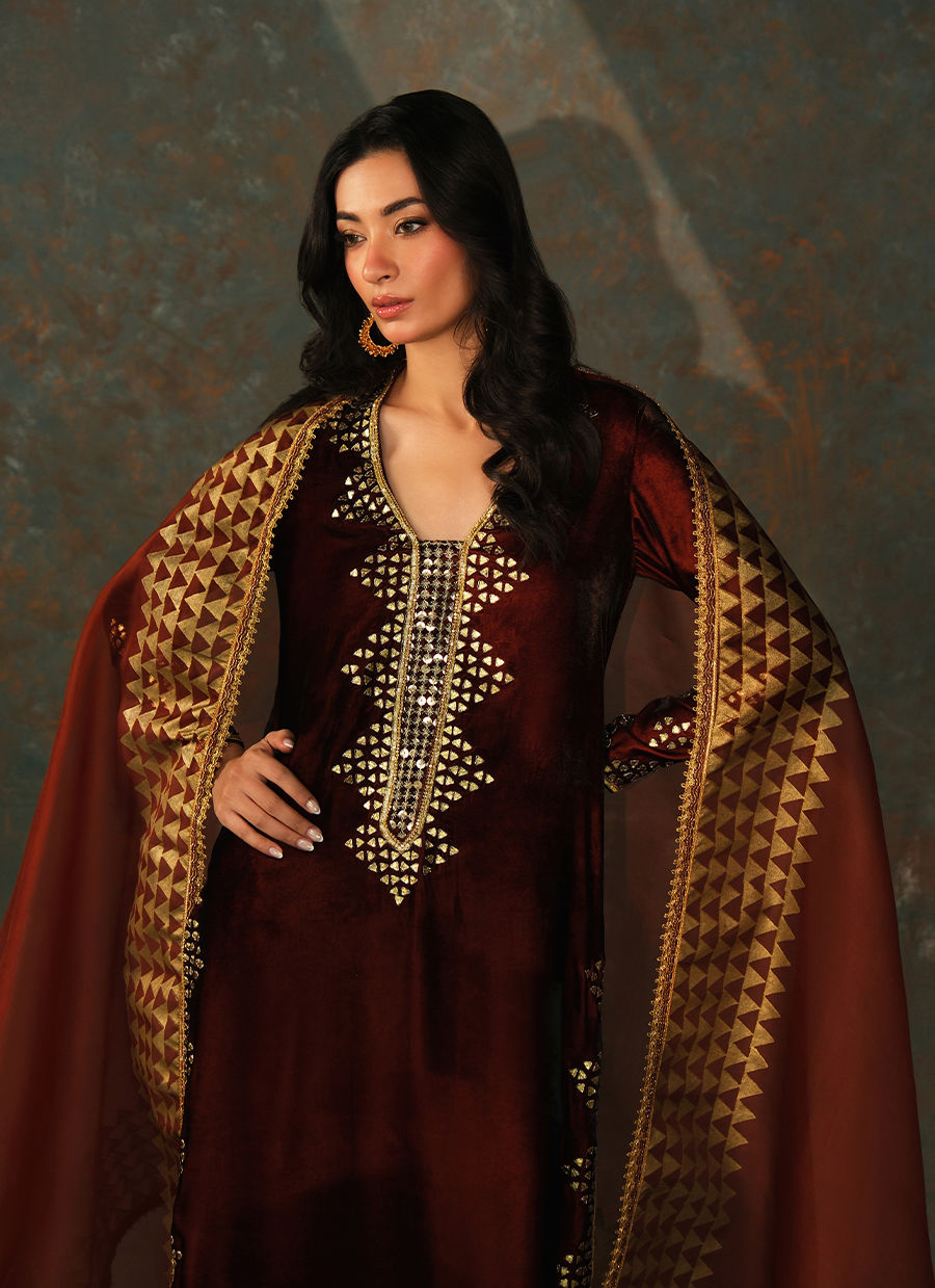 Crafted in deep burnt-garnet velvet, this silhouette is adorned with geometric gota handwork that catches the light like glowing embers at dusk. Paired with a firey block print organza dupata the look blends tradition and modern finesse. Comes with wide legged Korean silk pants.