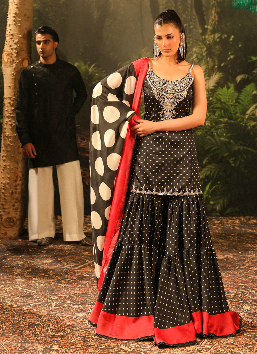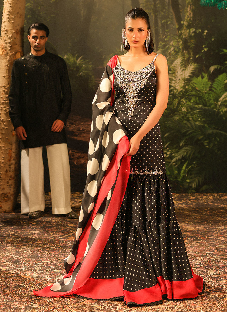 Color: Black Fabric: Shirt and Gharara: Satin, Dupatta: Silk Work Details: Handwork