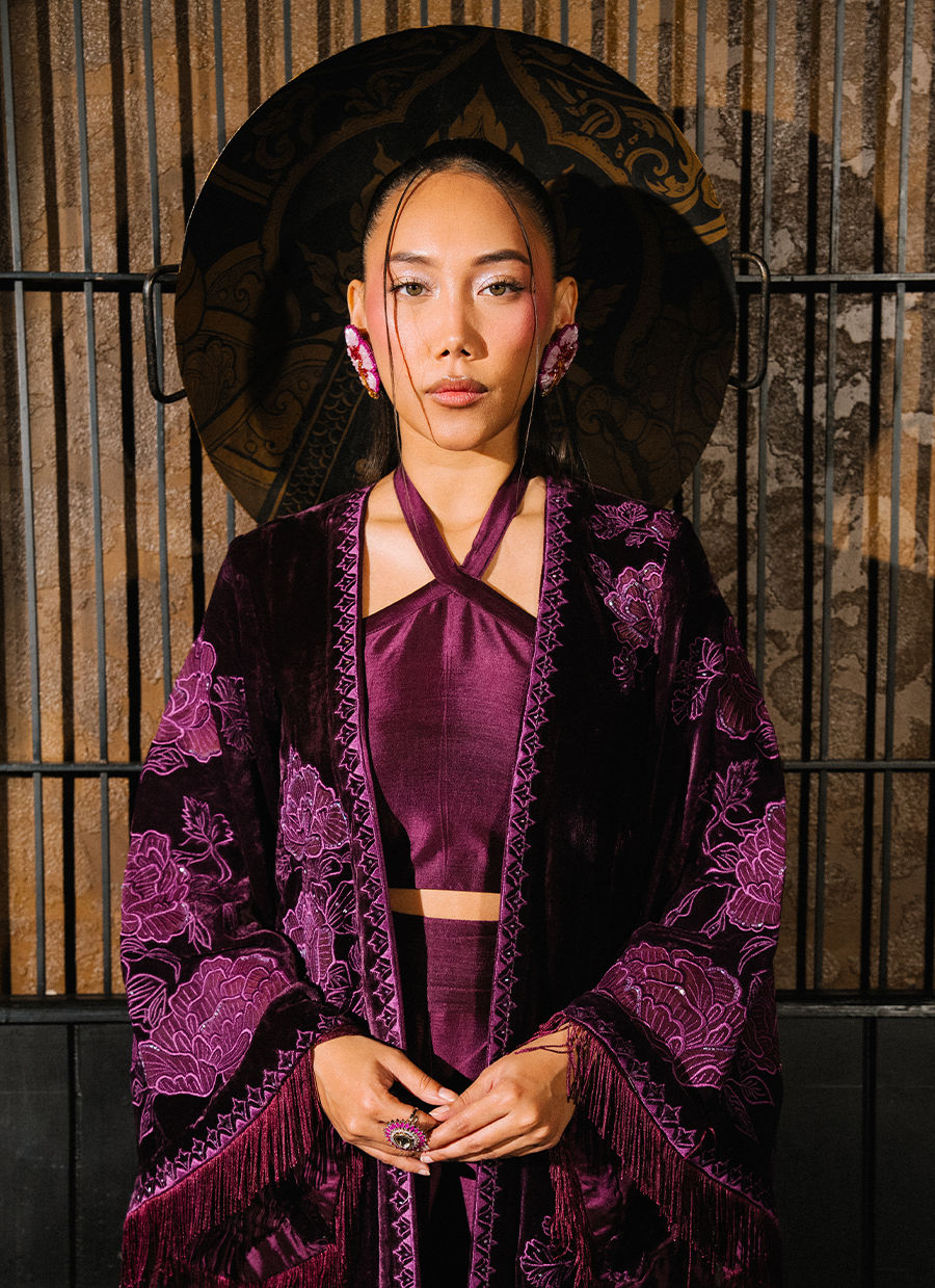 A long plum kimono jacket featuring dramatic, ultra-flared sleeves embellished with oversized organza appliqué and intricate embroidery. The sleeves are elevated with delicate fringe detailing and subtle handwork touches, adding movement and richness to the silhouette. Paired with a halter crisscross bandeau and flared sheesha silk pants, this ensemble blends statement artistry with modern elegance—bold, fluid, and unmistakably striking.