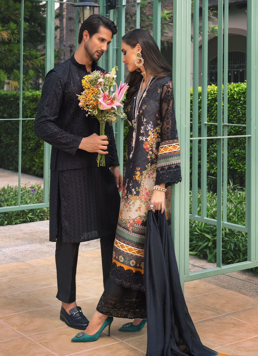 Cut on pristine pure raw silk 'Enya' features floral and geometrical self-printed details, the neckline is adorned with gota and shimmering lace on a contrasting sage green canvas. The hem is enhanced with light catching embroidered organza panel and criss-cross gota details. The shirt comes with pure silk ombre dupatta with gota finishing’s. The outfit can be paired with matching izaar.