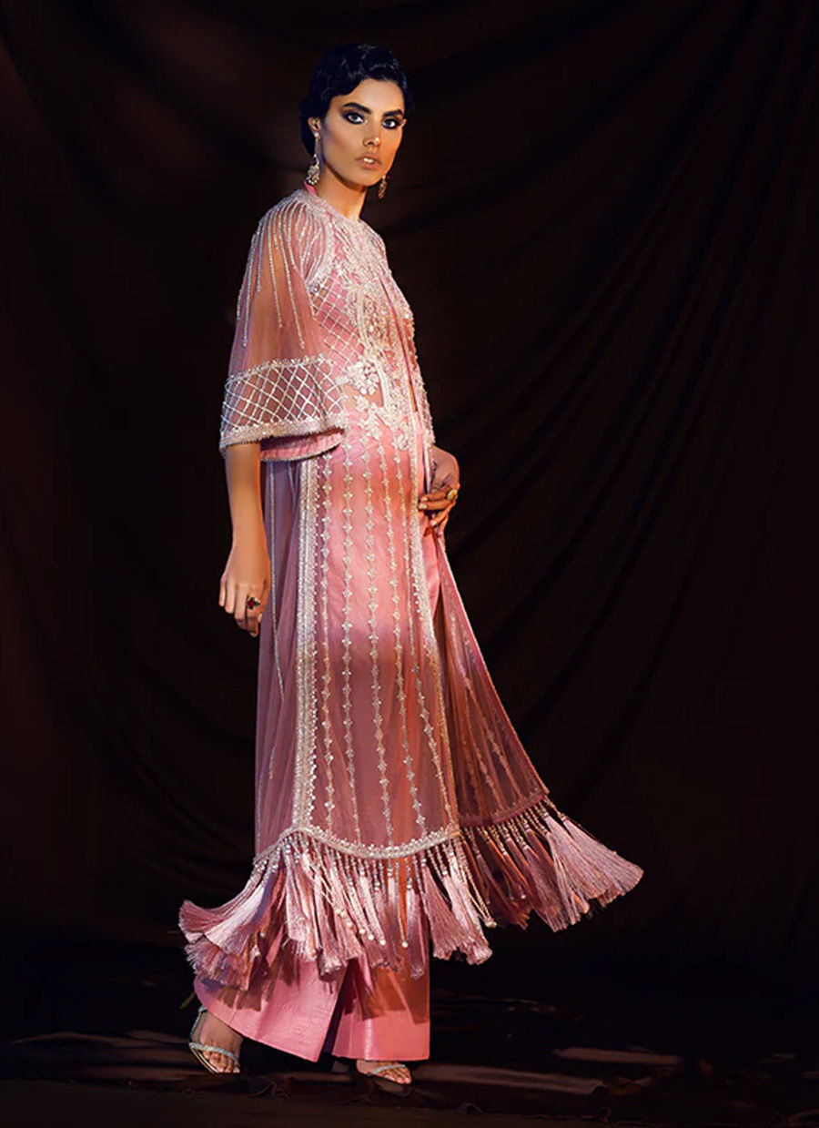 An exclusive collection that takes you on a journey of serenity and glamour.This evening/cocktail Demi Couture jacket has signature glittering embroidery of ZAIN HASHMI.The delicate shimmer embroidery on it is inspired by the orchids that blooms at night.