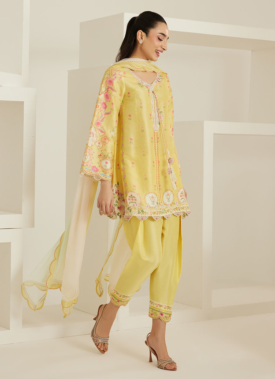 Radiant and uplifting, Evelina captures the essence of festive mornings wrapped in effortless elegance. Crafted in pure raw silk, the shirt is adorned with delicate floral motifs that bloom across a warm sunlit yellow base, creating a look that feels vibrant yet refined.