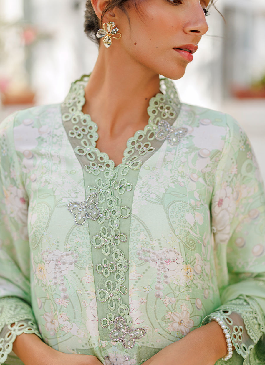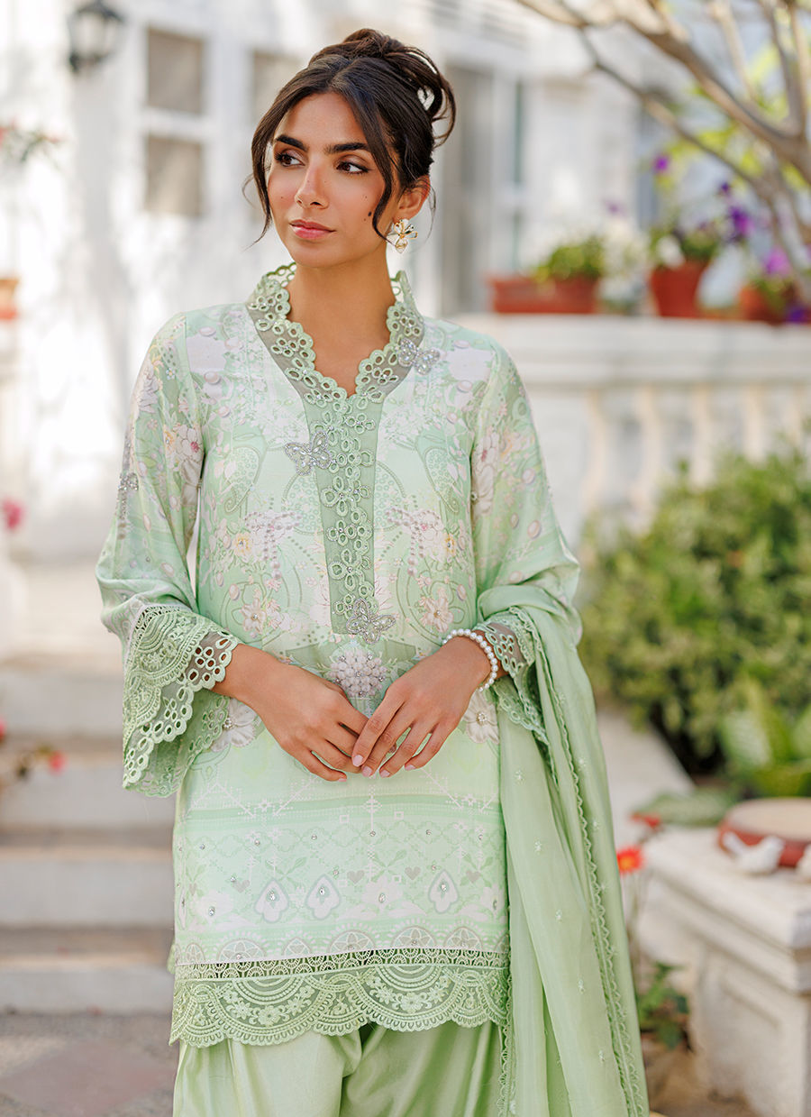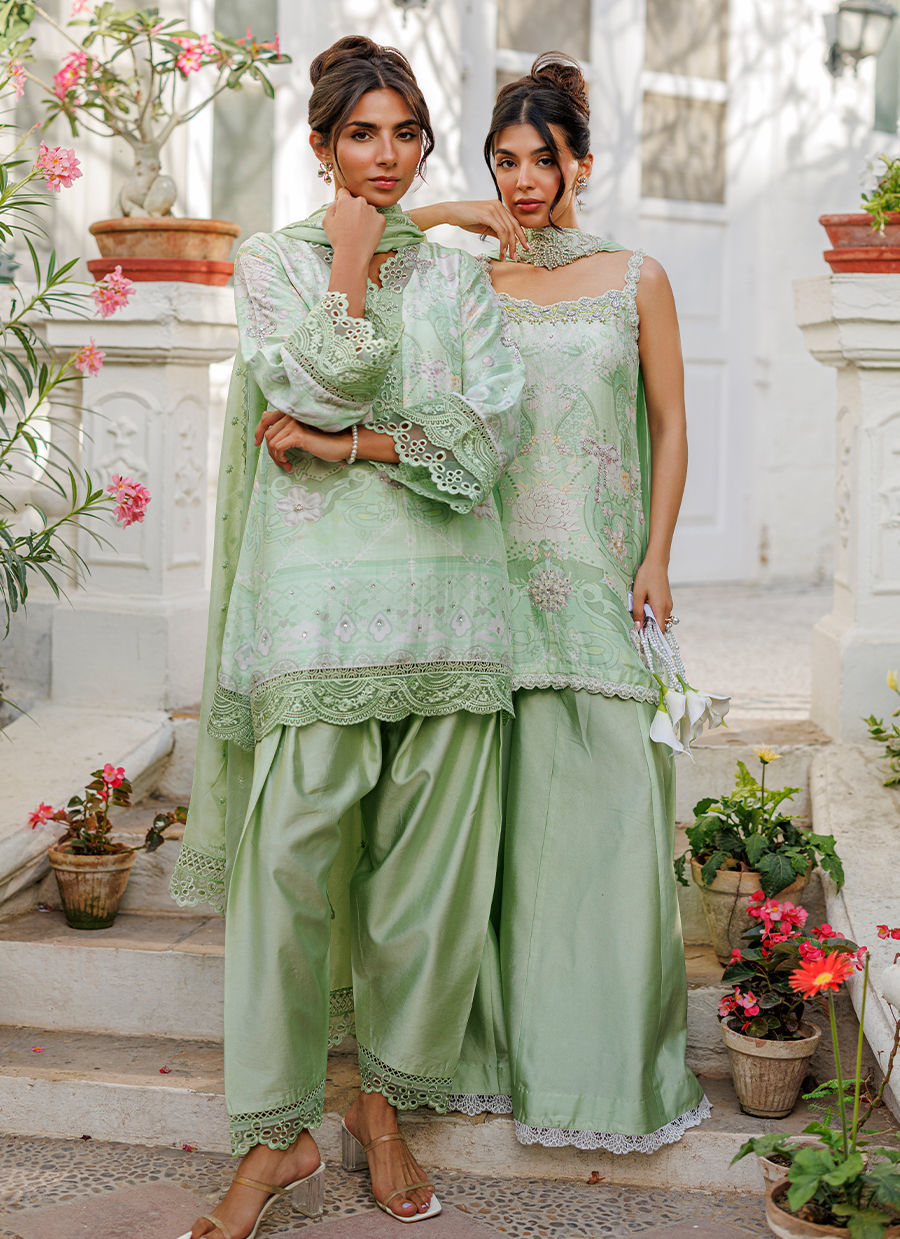 A refreshing mint ensemble featuring a pure raw silk short kurta adorned with a subtle print, enhanced by delicate silver handwork and organza detailing. The collar is accented with tiny butterfly embellishments, adding a touch of charm to the design. It is paired with a mint shalwar and complemented by a medium silk dupatta finished with organza details. *Model is 5'10" and is wearing a size small.
