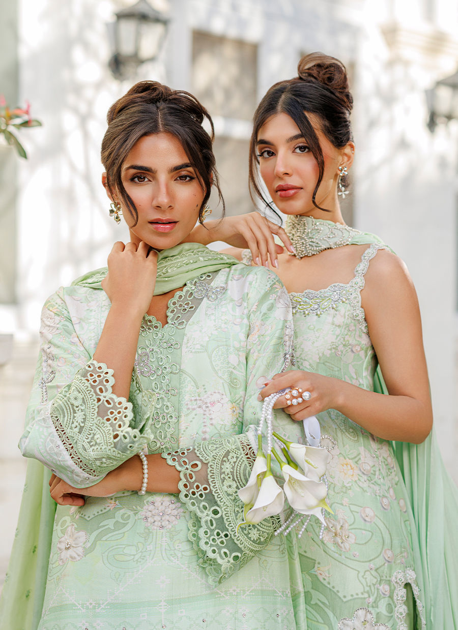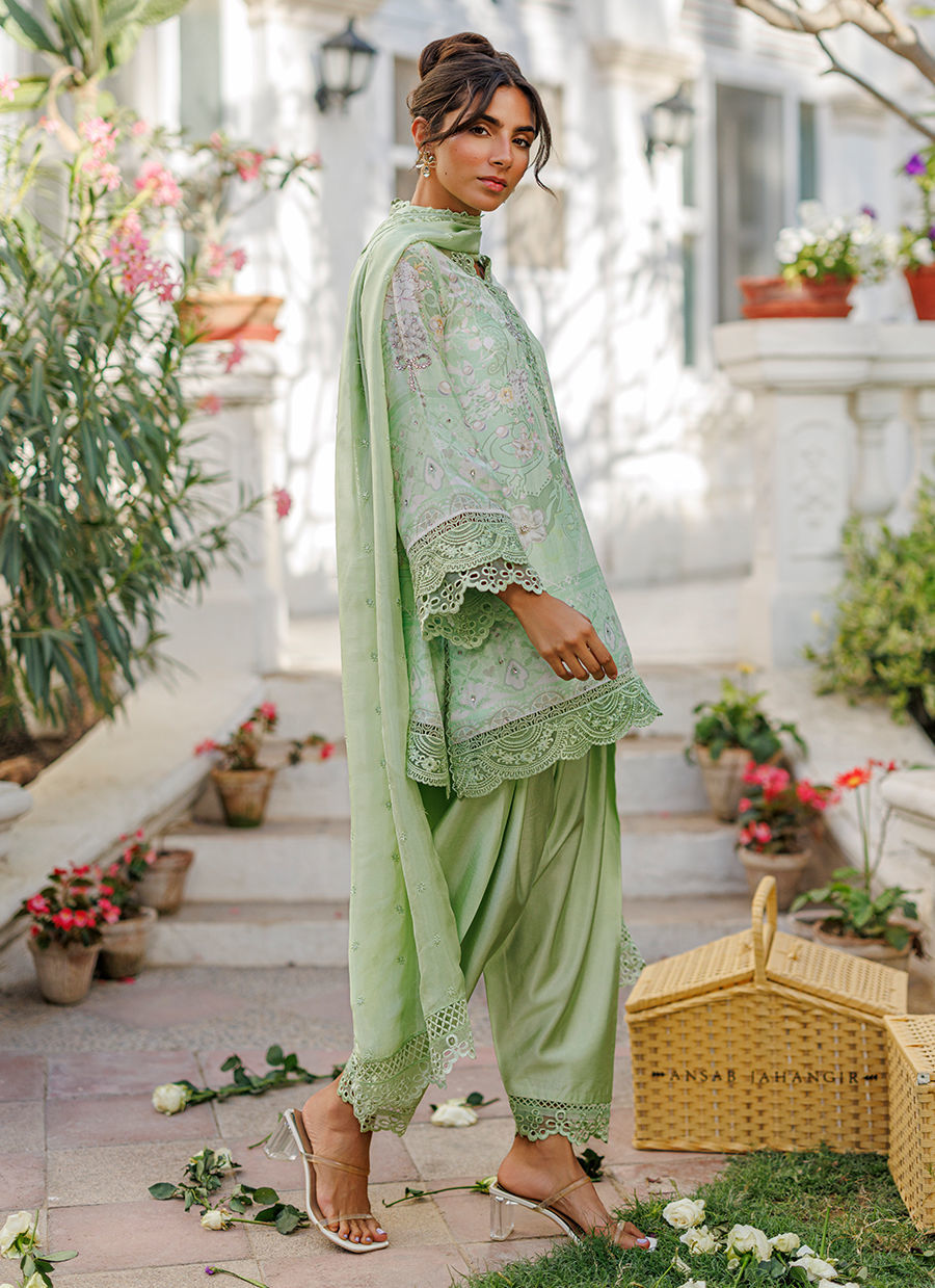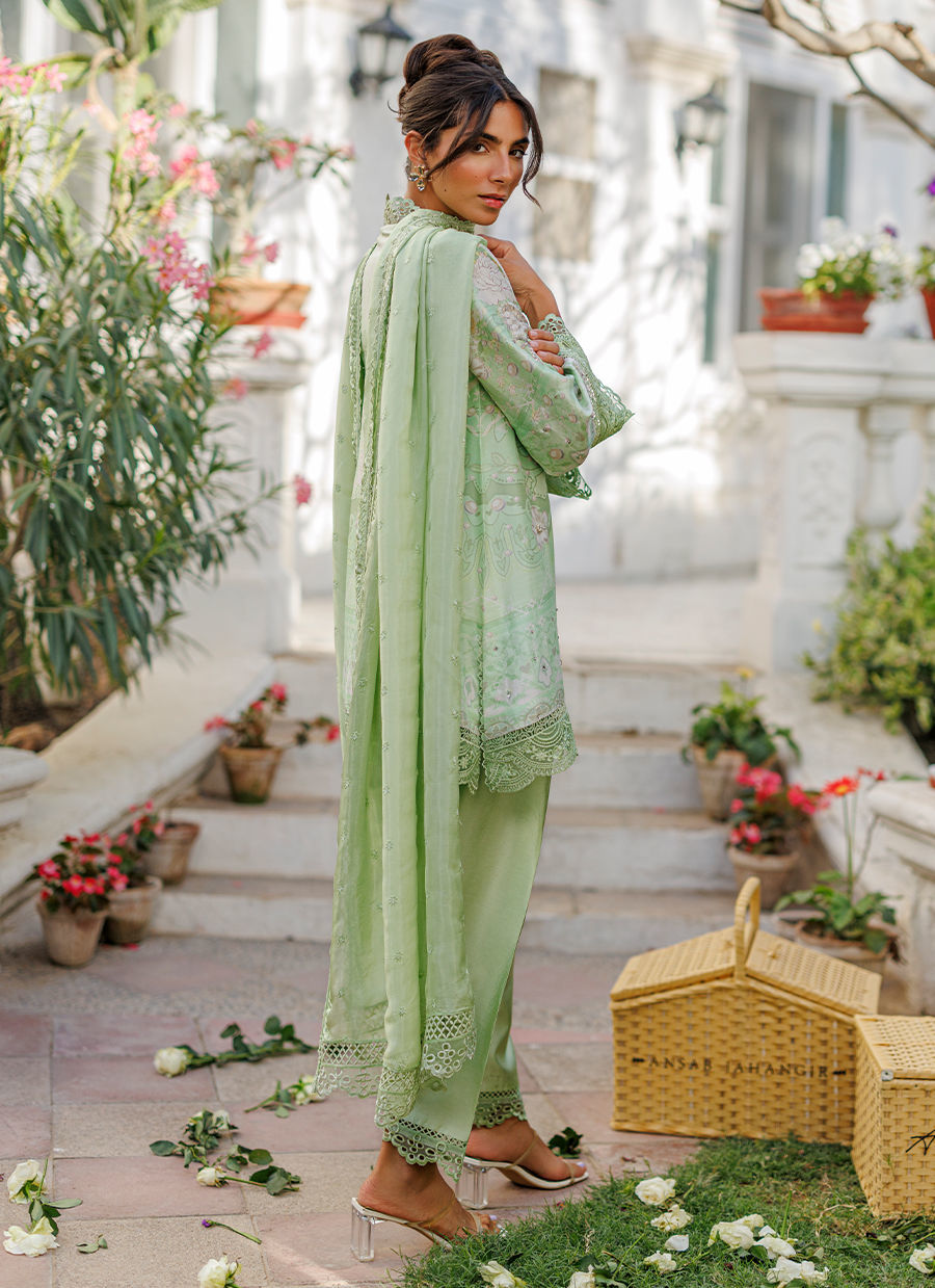A refreshing mint ensemble featuring a pure raw silk short kurta adorned with a subtle print, enhanced by delicate silver handwork and organza detailing. The collar is accented with tiny butterfly embellishments, adding a touch of charm to the design. It is paired with a mint shalwar and complemented by a medium silk dupatta finished with organza details. *Model is 5'10" and is wearing a size small.