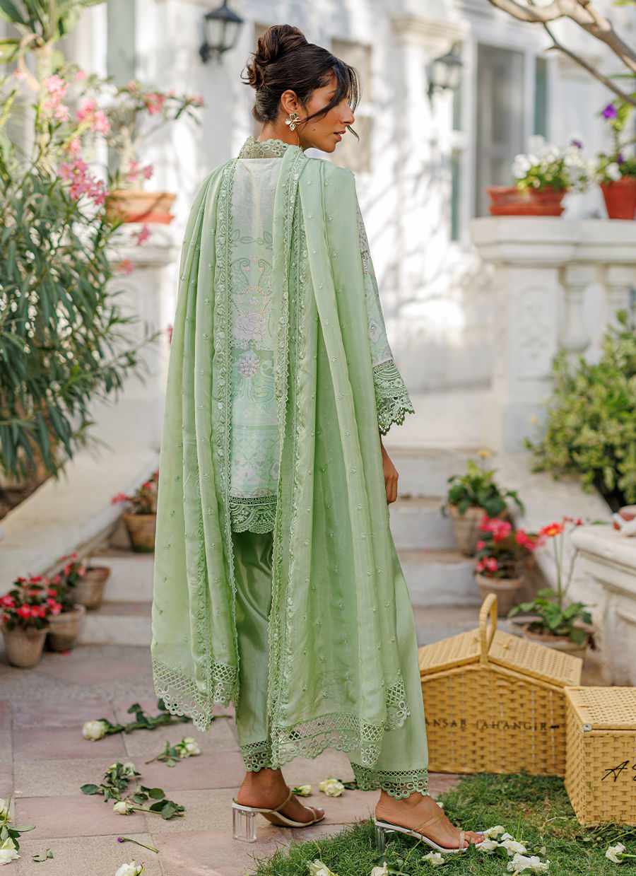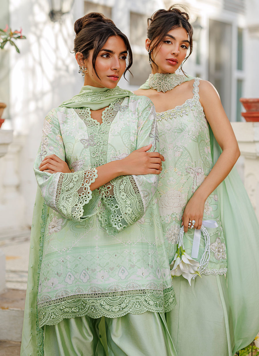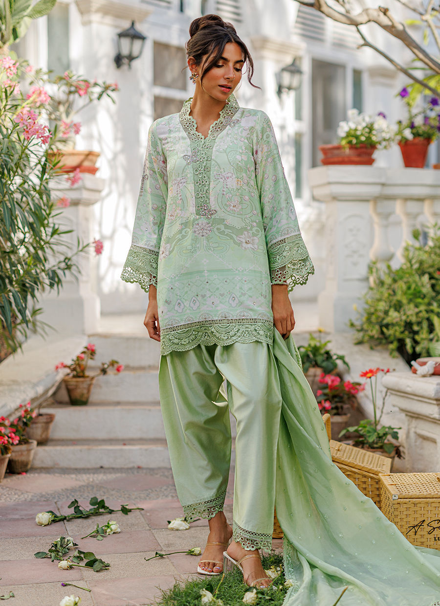 A refreshing mint ensemble featuring a pure raw silk short kurta adorned with a subtle print, enhanced by delicate silver handwork and organza detailing. The collar is accented with tiny butterfly embellishments, adding a touch of charm to the design. It is paired with a mint shalwar and complemented by a medium silk dupatta finished with organza details. *Model is 5'10" and is wearing a size small.