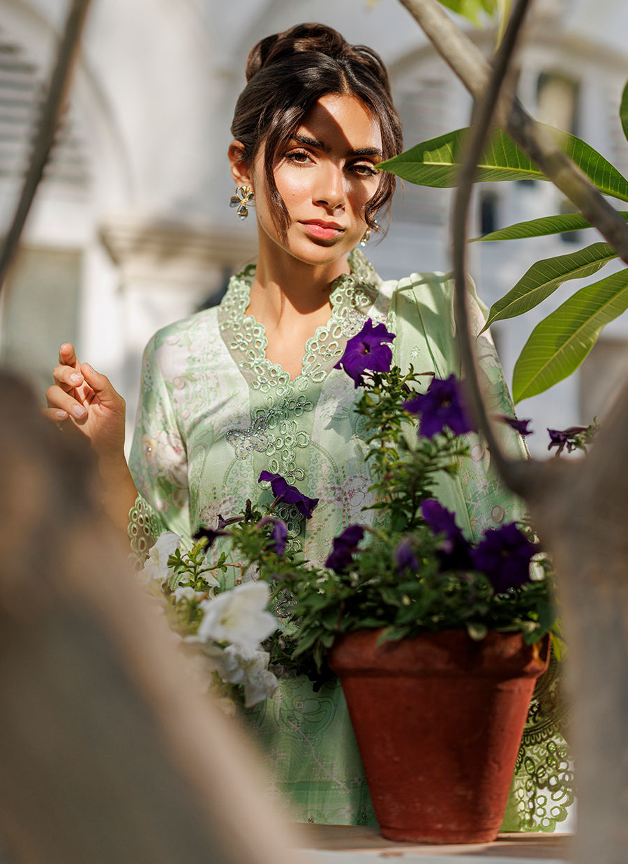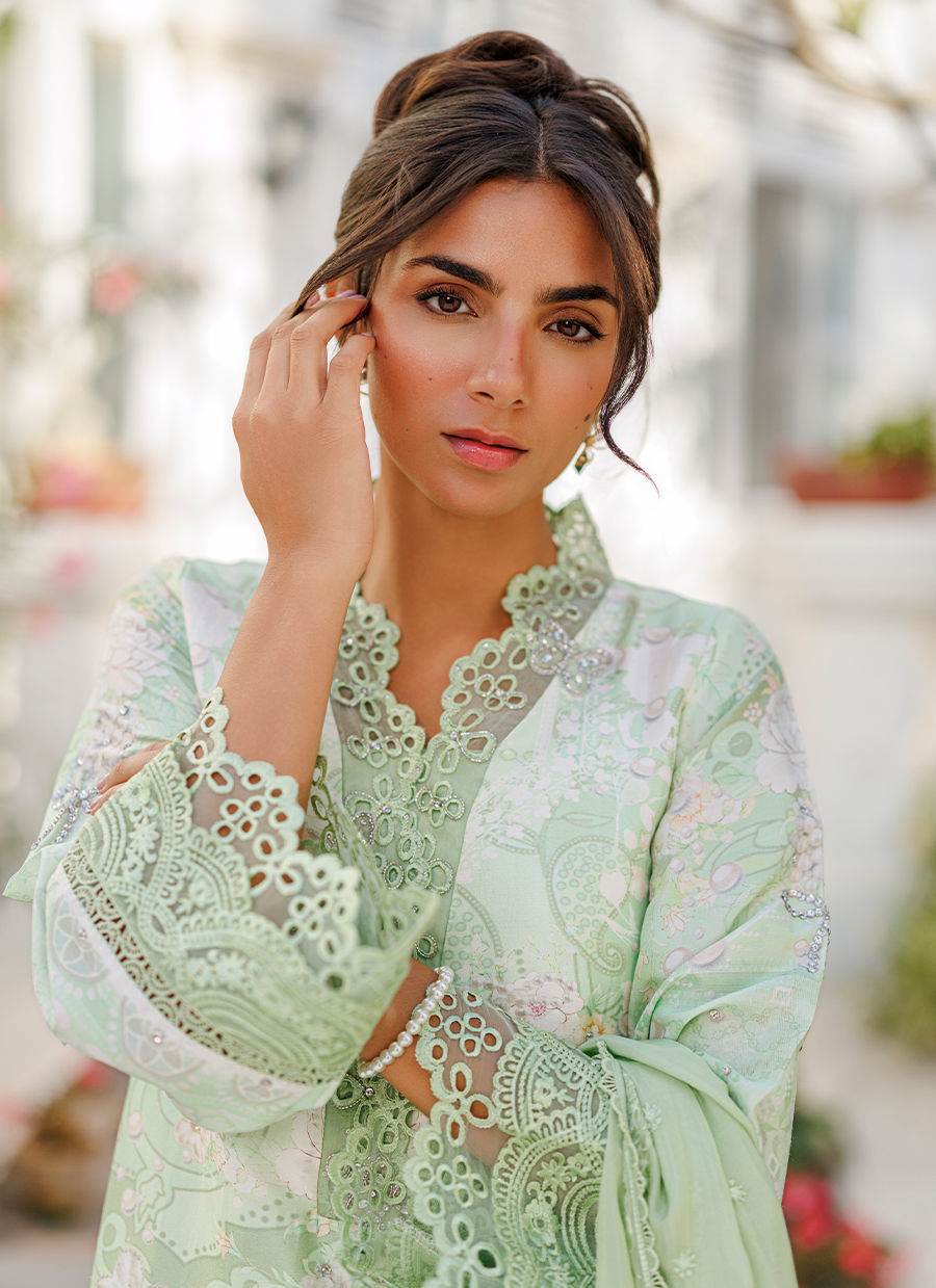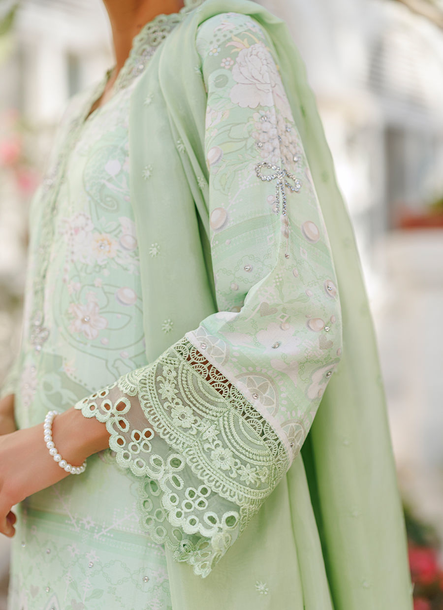 A refreshing mint ensemble featuring a pure raw silk short kurta adorned with a subtle print, enhanced by delicate silver handwork and organza detailing. The collar is accented with tiny butterfly embellishments, adding a touch of charm to the design. It is paired with a mint shalwar and complemented by a medium silk dupatta finished with organza details. *Model is 5'10" and is wearing a size small.